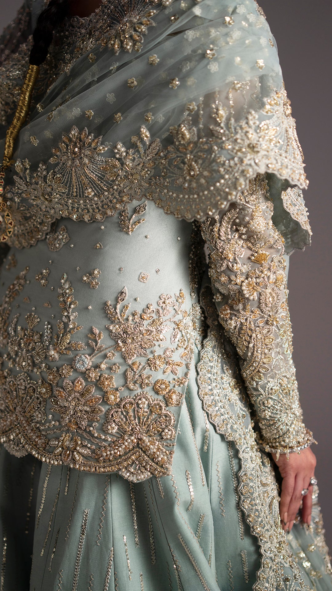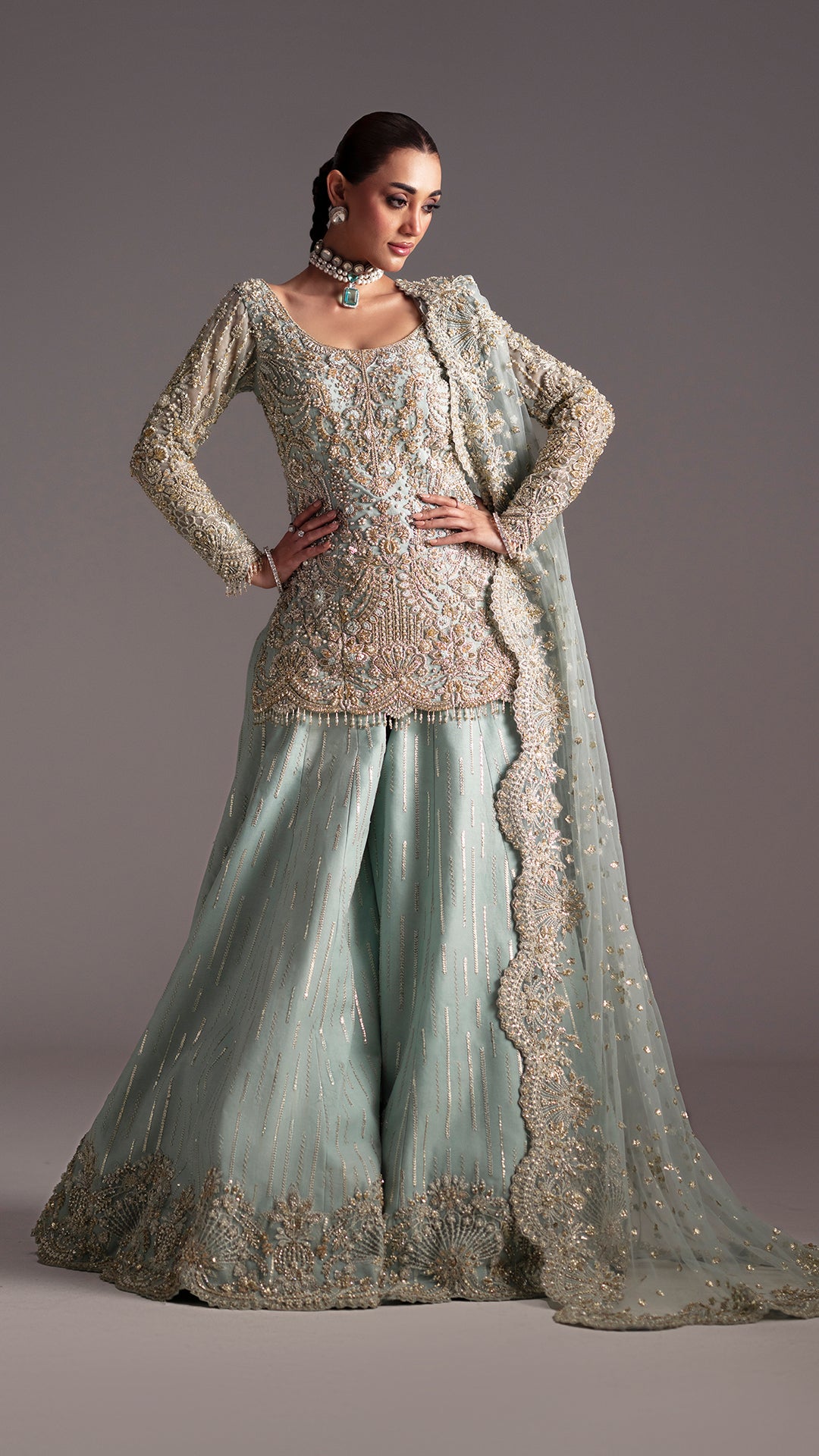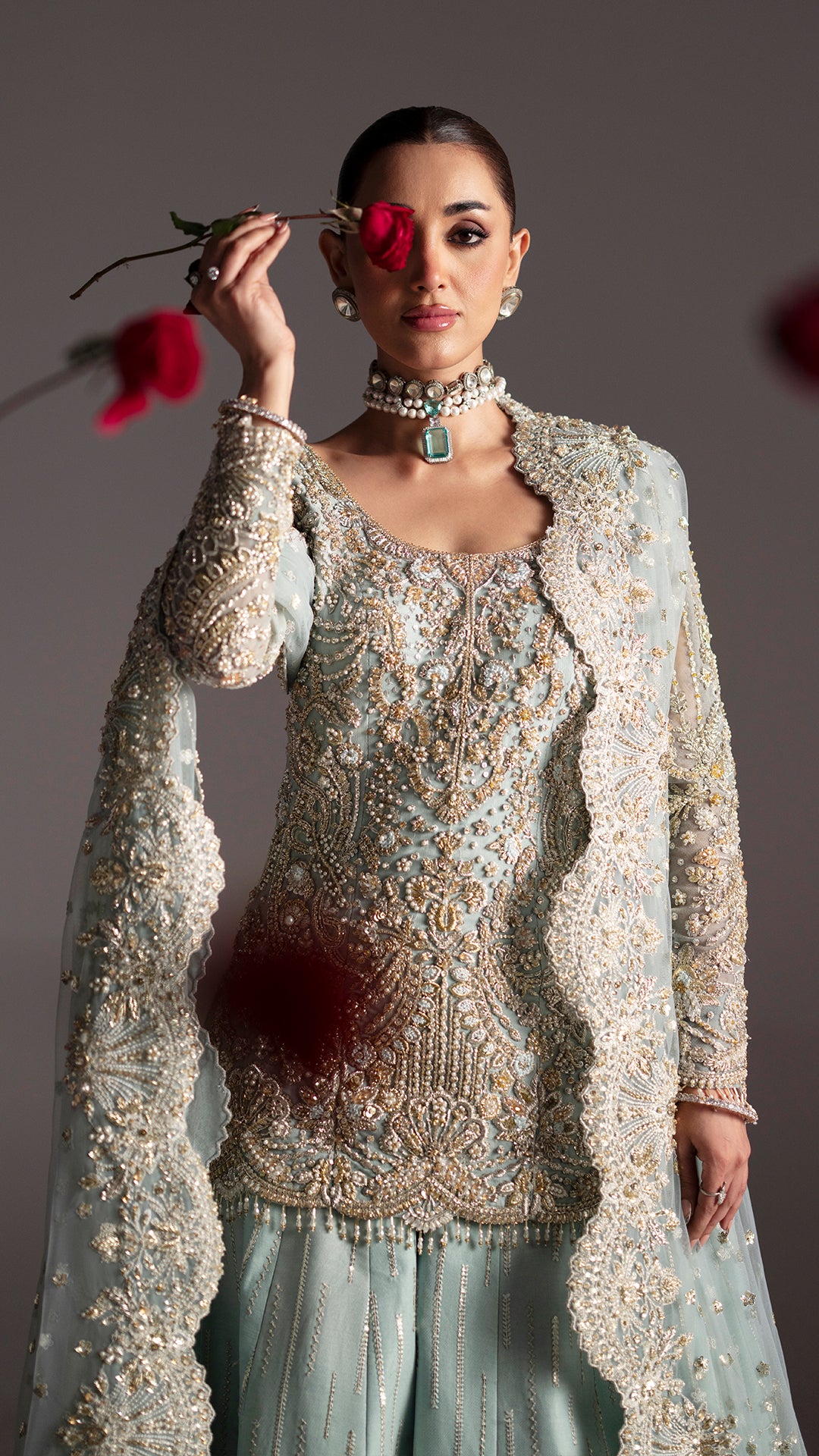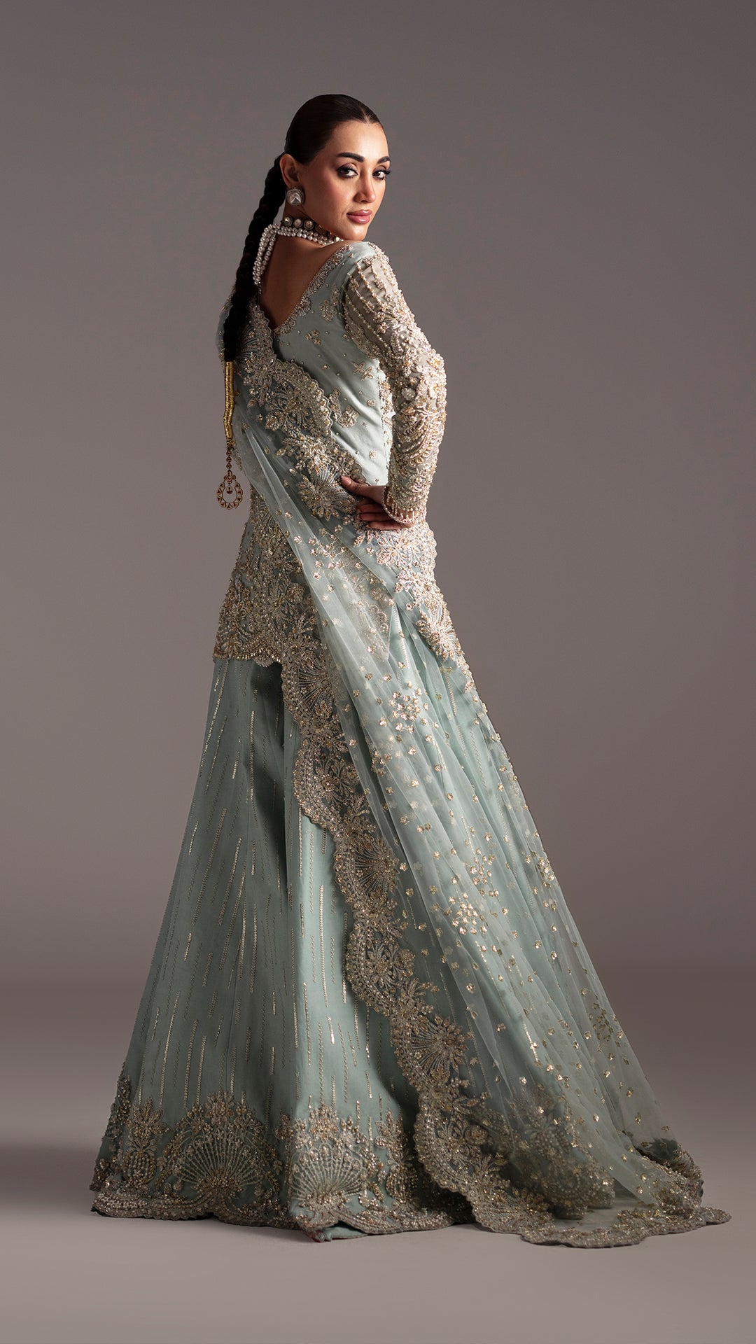 Drenched in light blue, Adaa is a metamorphic ensemble that glides seamlessly across occasion from the intimacy of a nikkah to the grandeur of a reception.