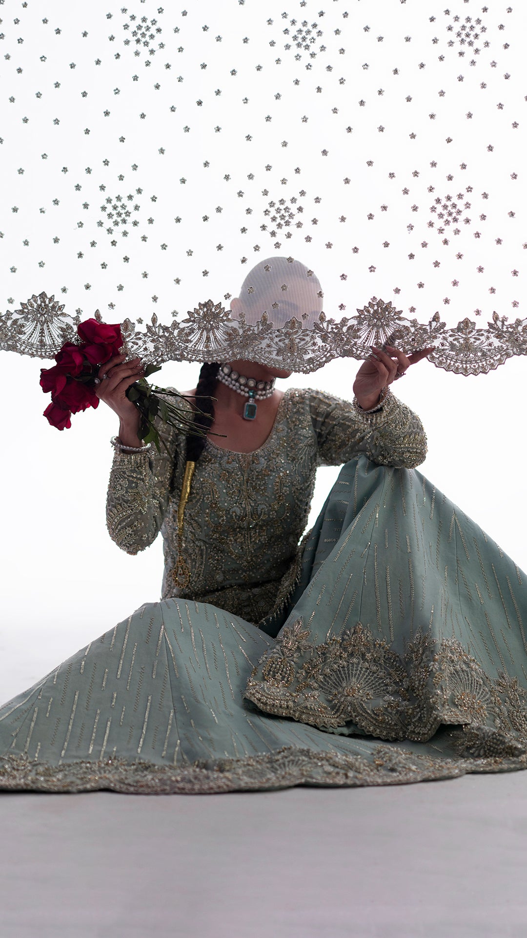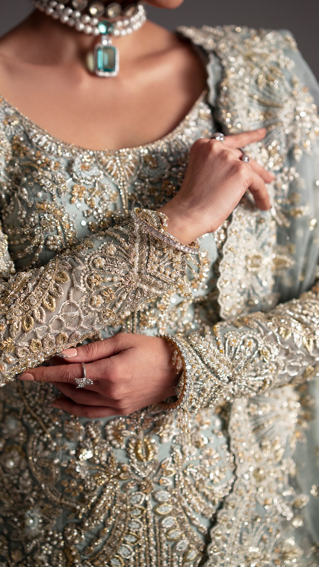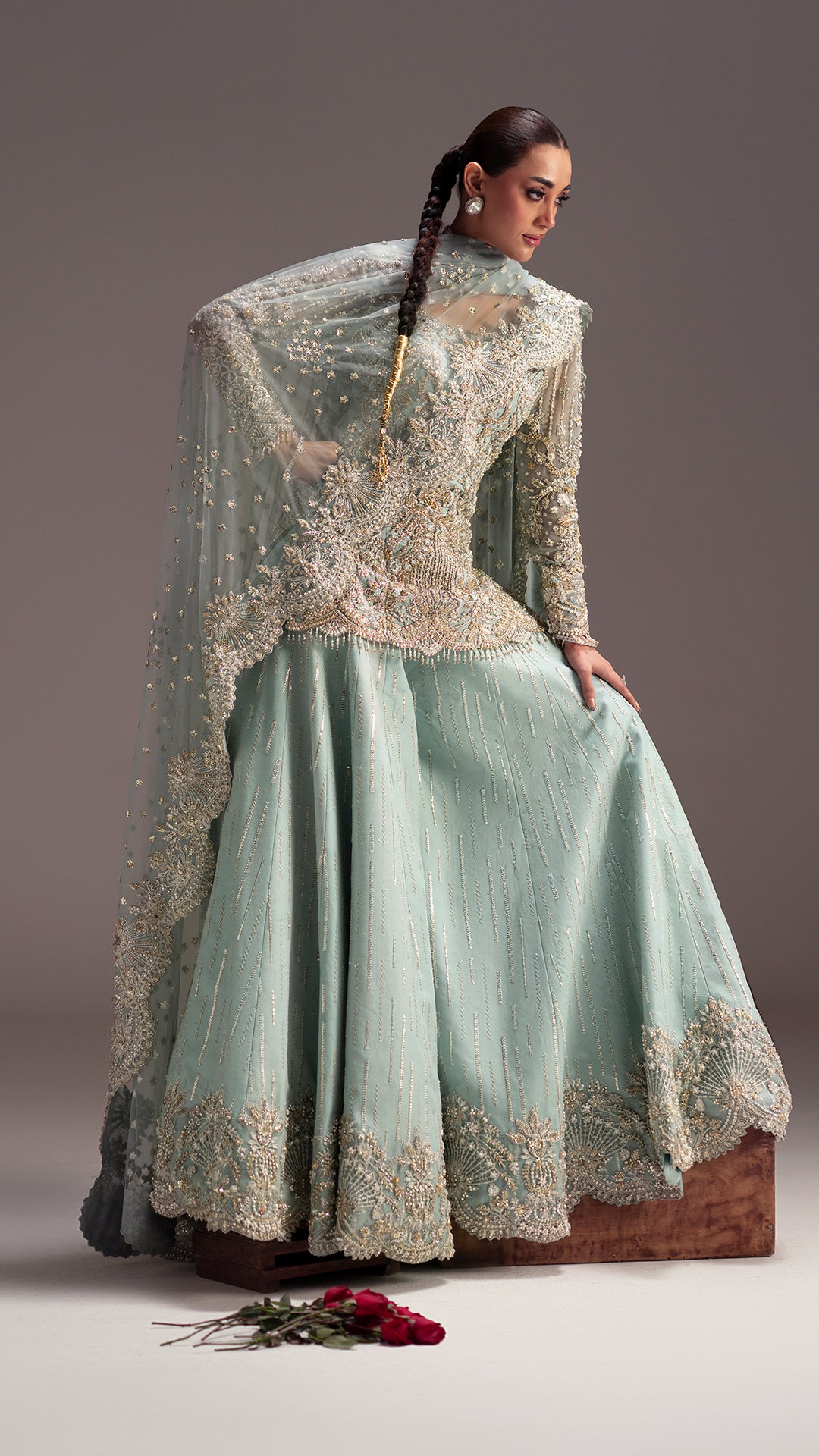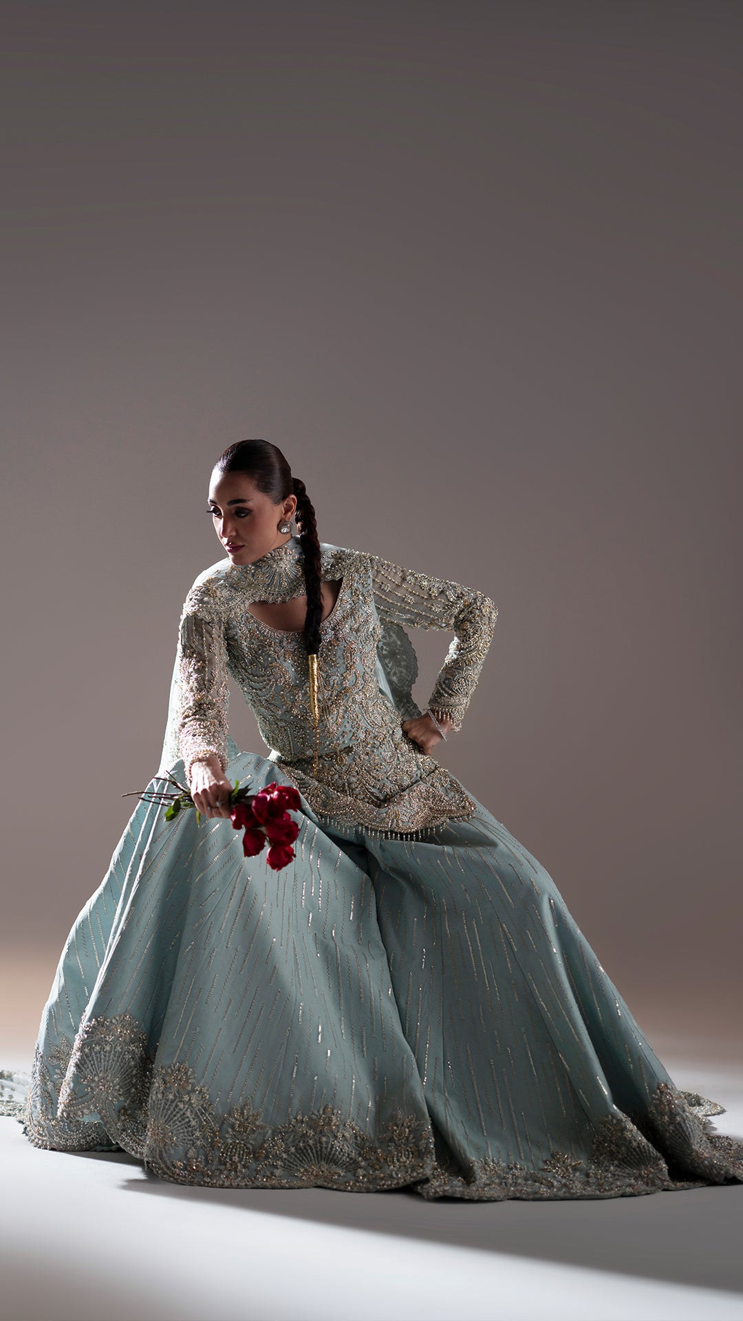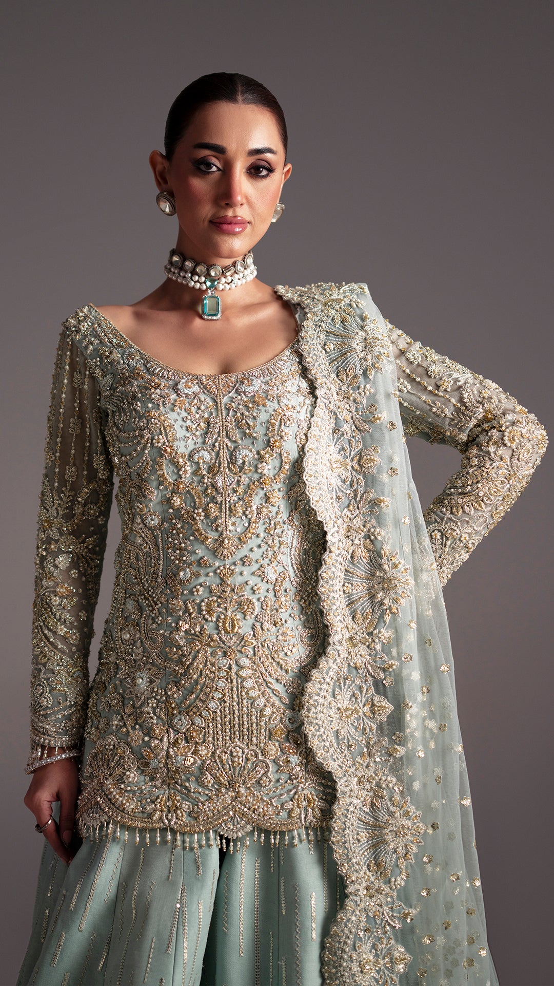 Drenched in light blue, Adaa is a metamorphic ensemble that glides seamlessly across occasion from the intimacy of a nikkah to the grandeur of a reception.