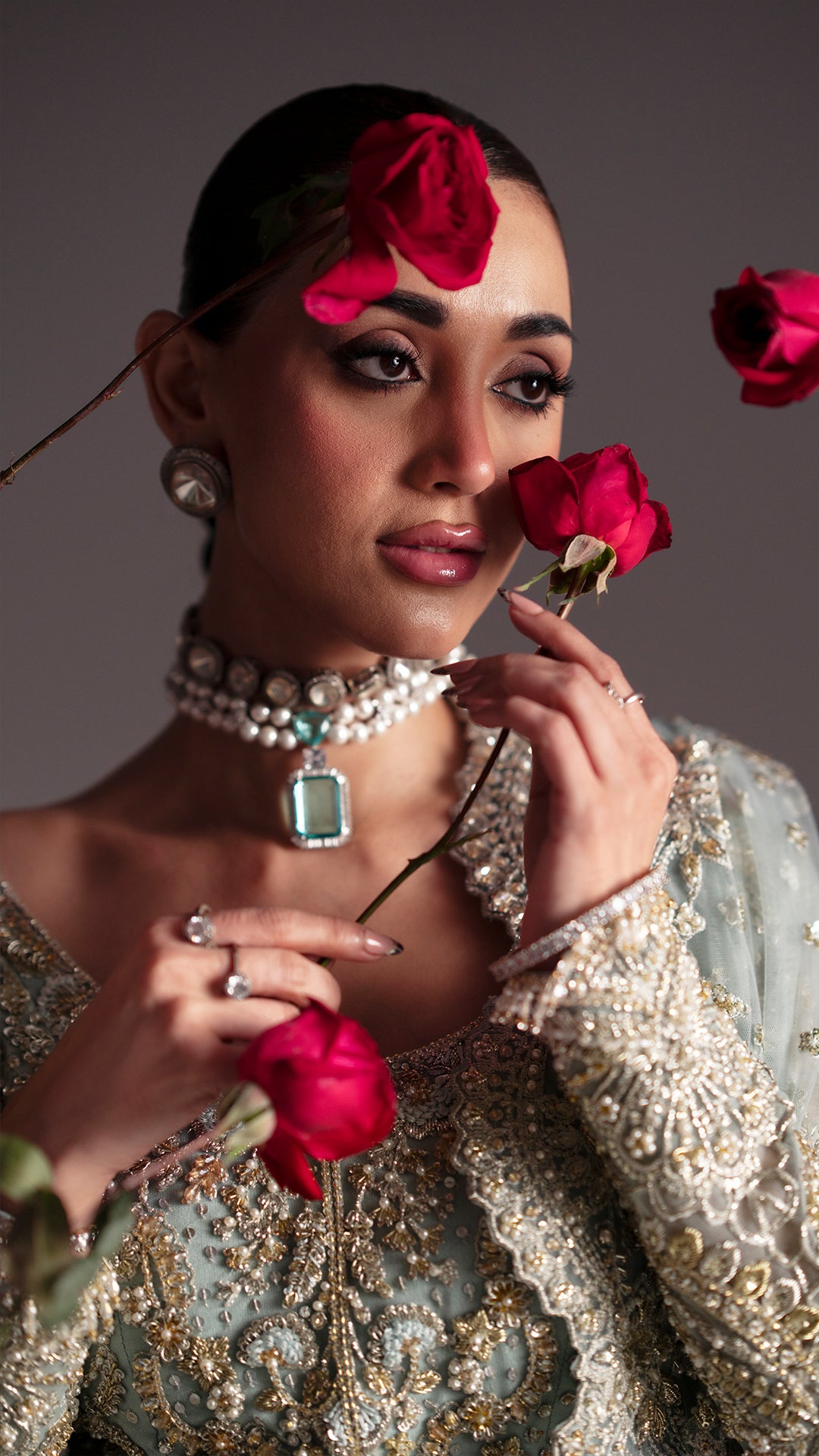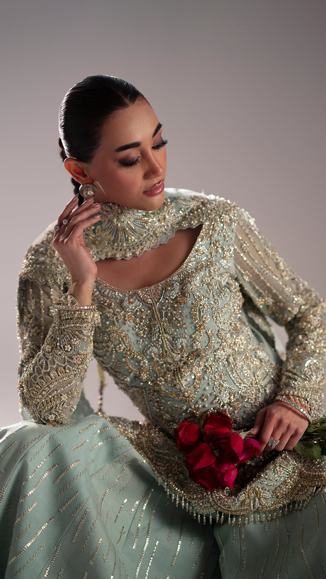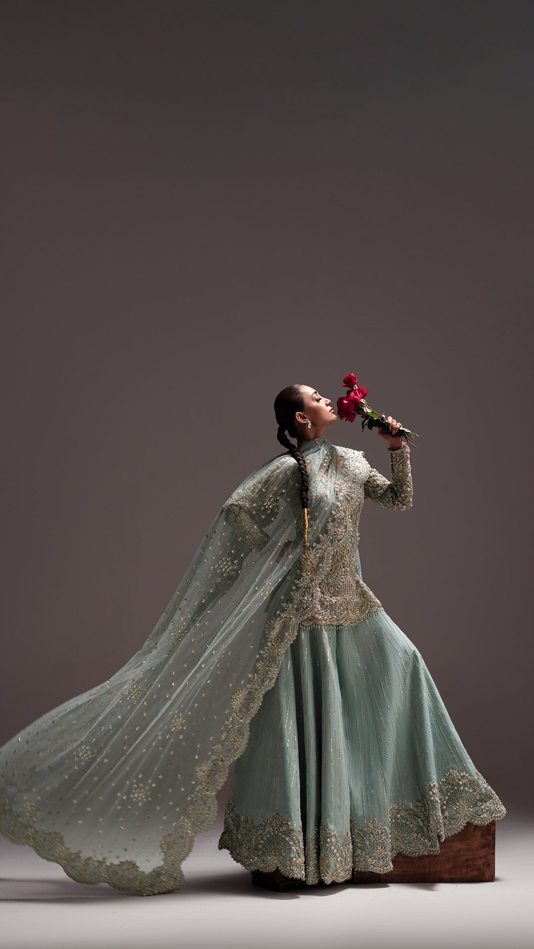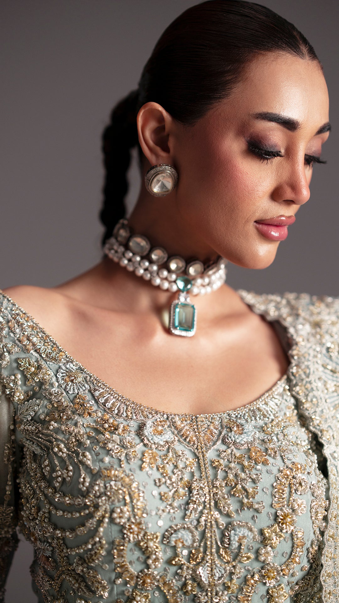 Drenched in light blue, Adaa is a metamorphic ensemble that glides seamlessly across occasion from the intimacy of a nikkah to the grandeur of a reception.