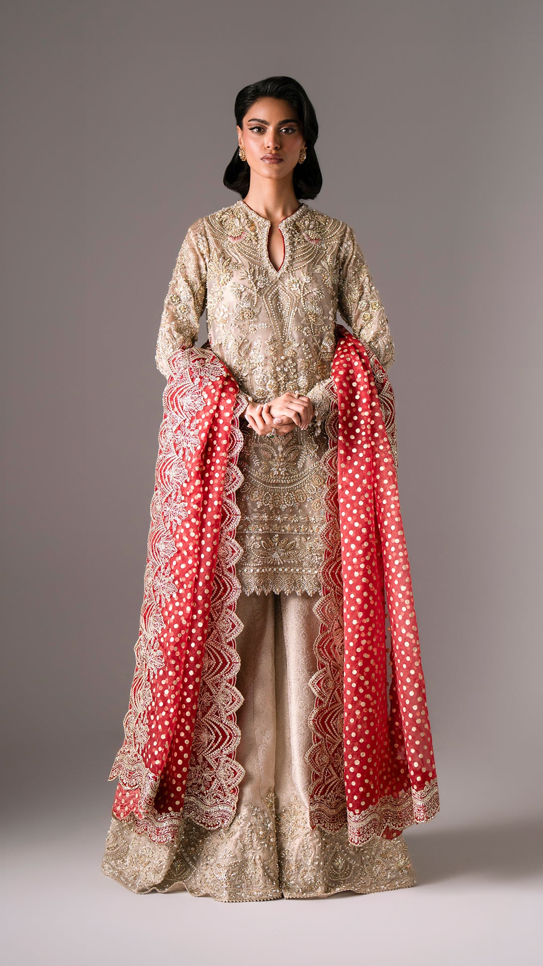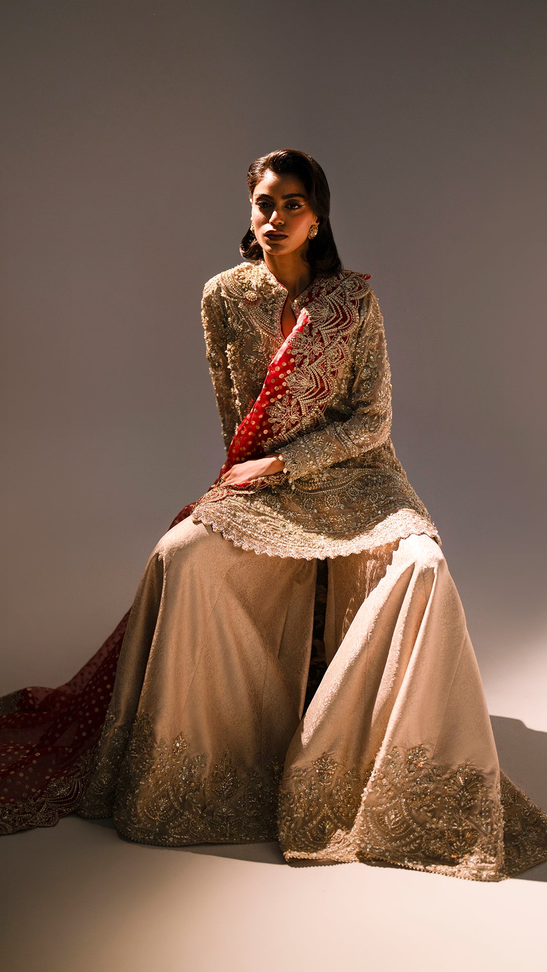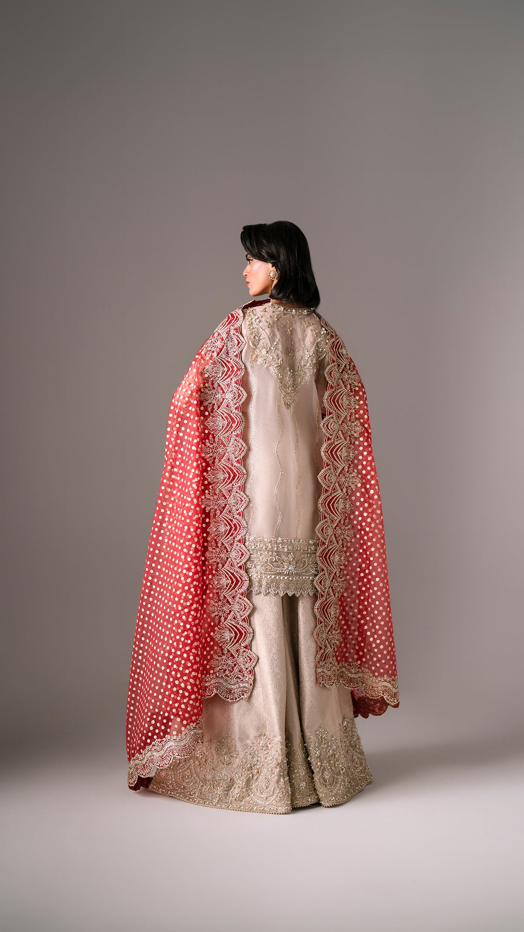 A true statement for refined luxury ‘ELEA’ captivates with its shimmering tissue fabric shirt with pure jamawar sharara pants that have cascading border on the bottom, paired with contrasting block printed polka dots on fine organza fabric adding a unique touch of sophistication. It’s like wearing a piece of art that elevates your presence with its subtle charm and style.