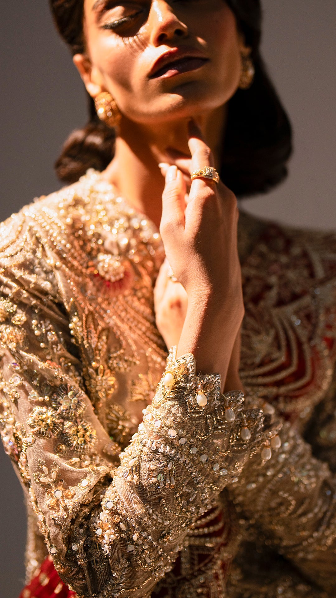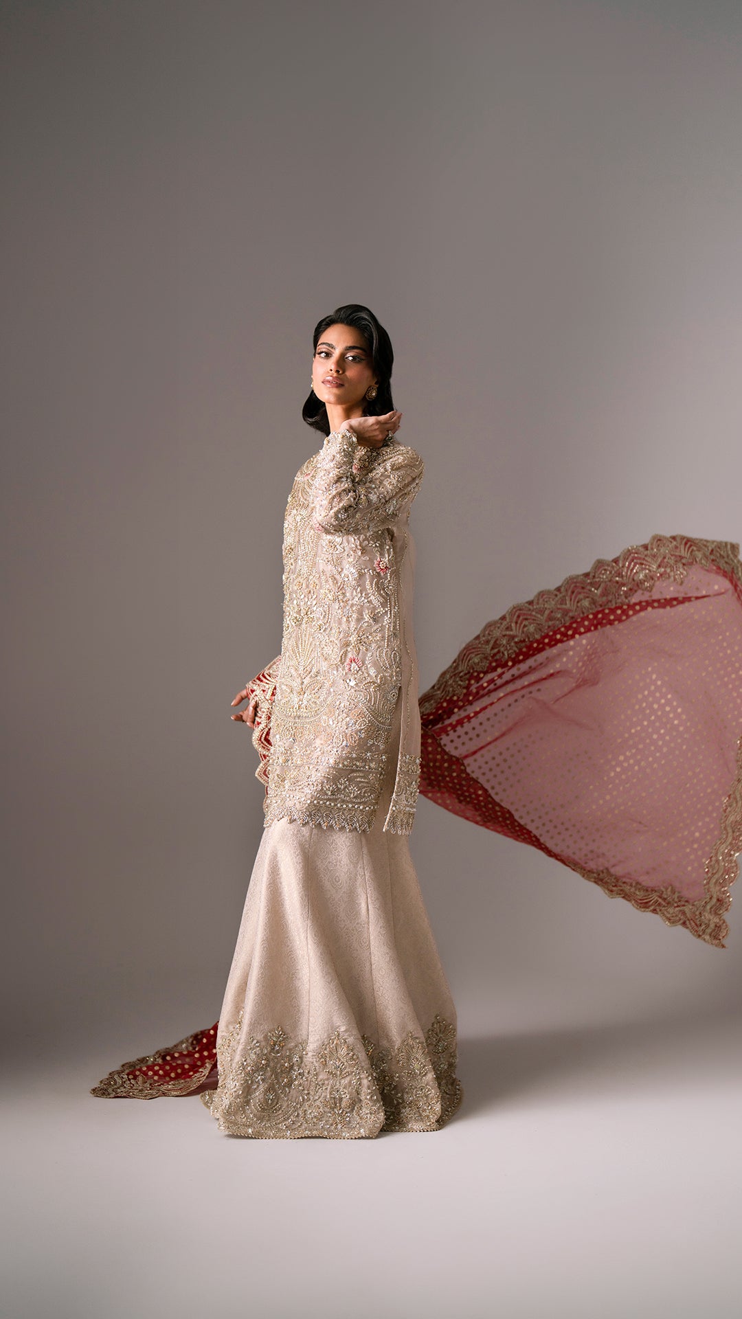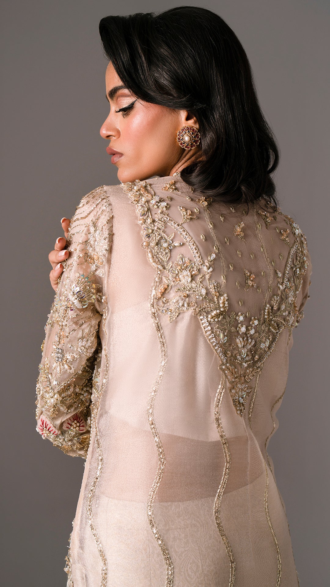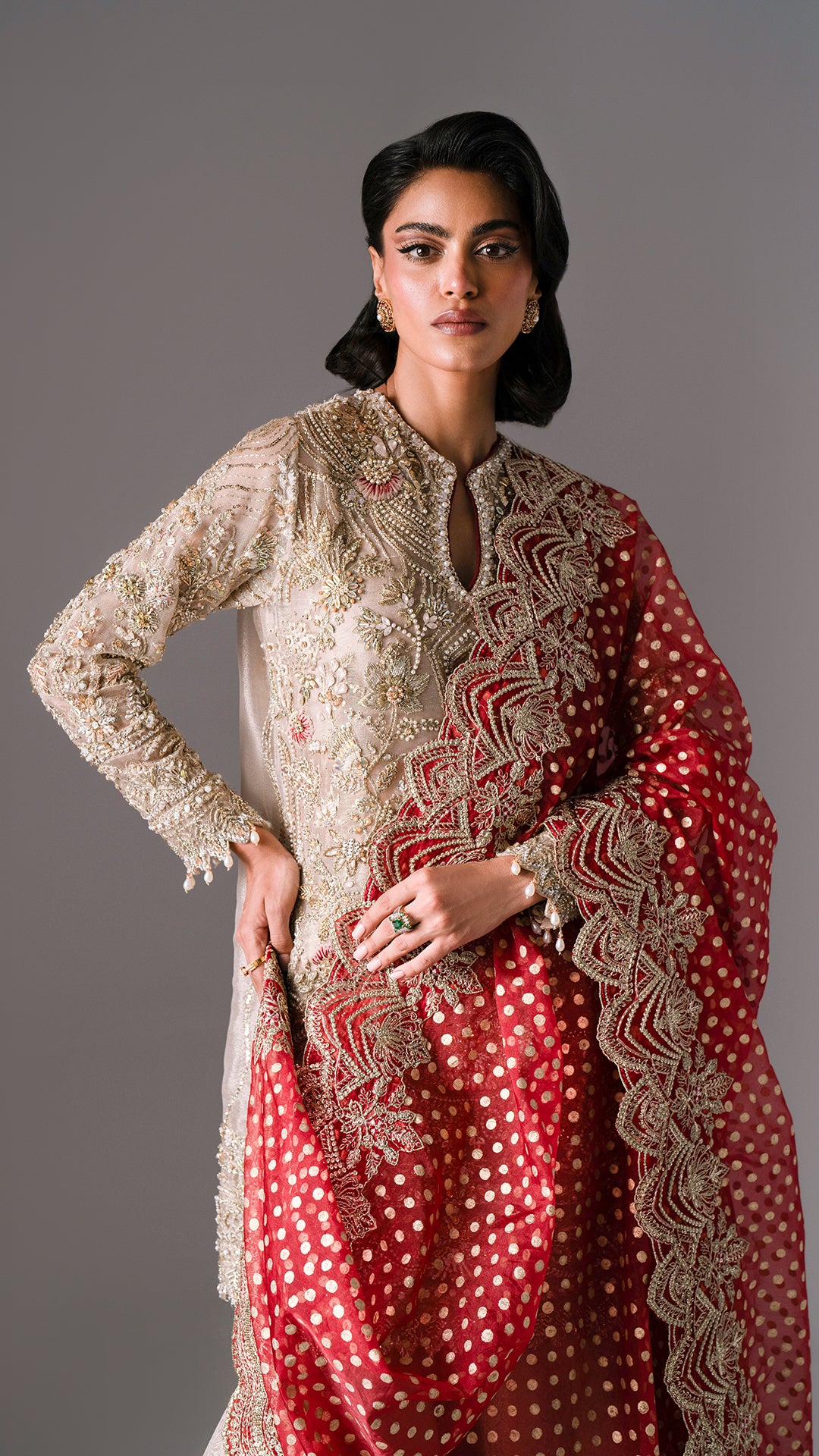 A true statement for refined luxury ‘ELEA’ captivates with its shimmering tissue fabric shirt with pure jamawar sharara pants that have cascading border on the bottom, paired with contrasting block printed polka dots on fine organza fabric adding a unique touch of sophistication. It’s like wearing a piece of art that elevates your presence with its subtle charm and style.