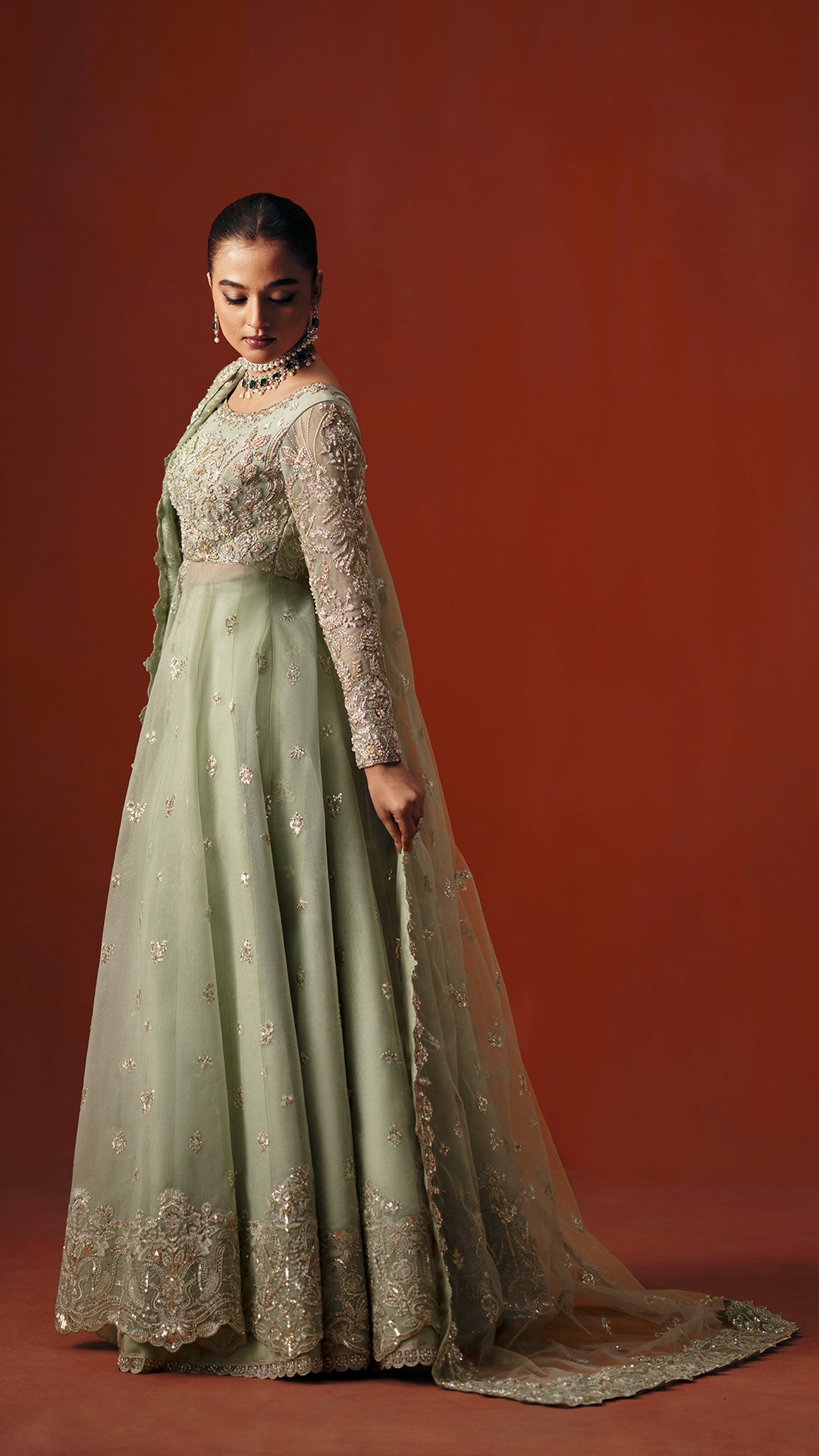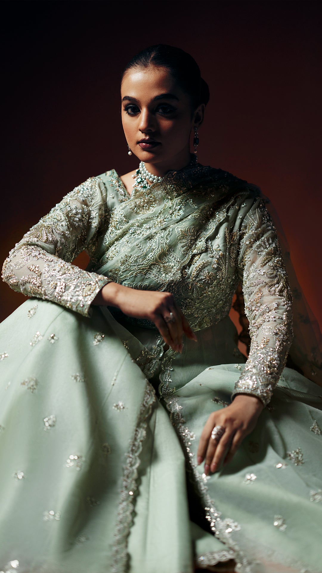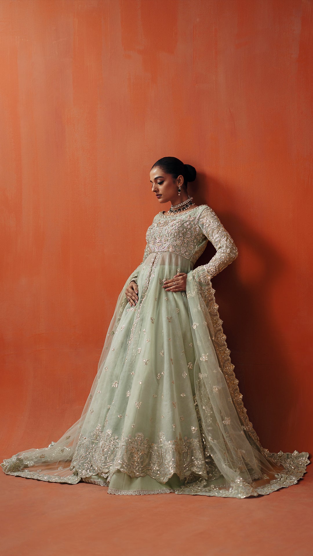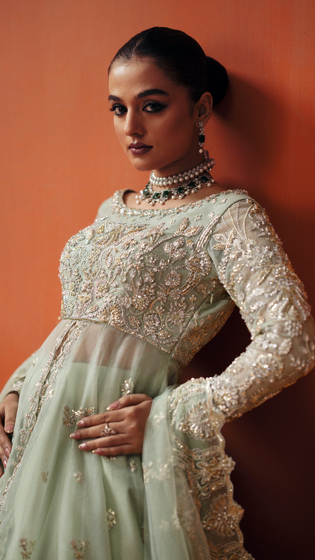A white kalidaar, front open pishwas designed to deliver elevated occasion wear impact. Refined hand embroidery across the bodice, sleeves, and dupatta creates a cohesive, high value aesthetic, balancing heritage craftsmanship with a clean, modern silhouette.