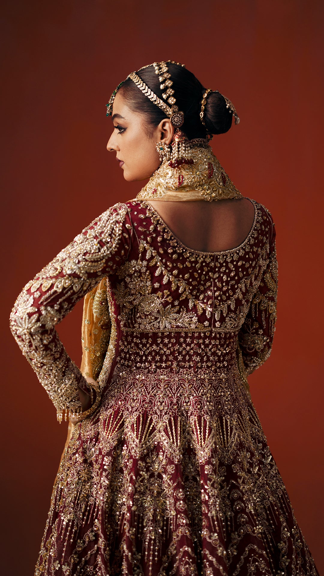 This bridal pishwas is a heritage piece, defined by precision led handwork and controlled opulence. Naqshi, dabka, resham, and sequins are layered with intent to create depth, texture, and calibrated shine. Intricate motifs enrich the surface while maintaining a clean, structured silhouette. Jewel toned accents optimize light play across the ensemble. Finished with an embellished dupatta, the design is built for timeless appeal and elevated ceremonial ROI.