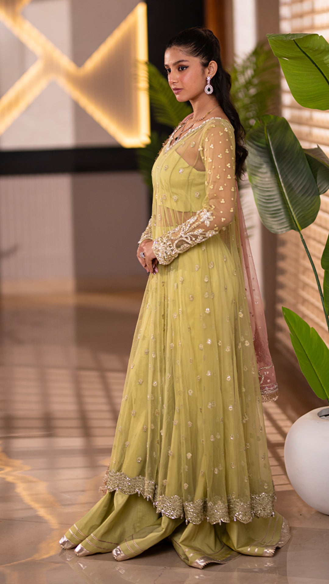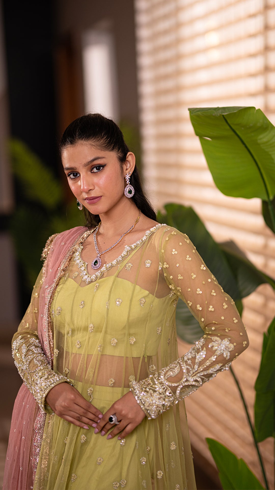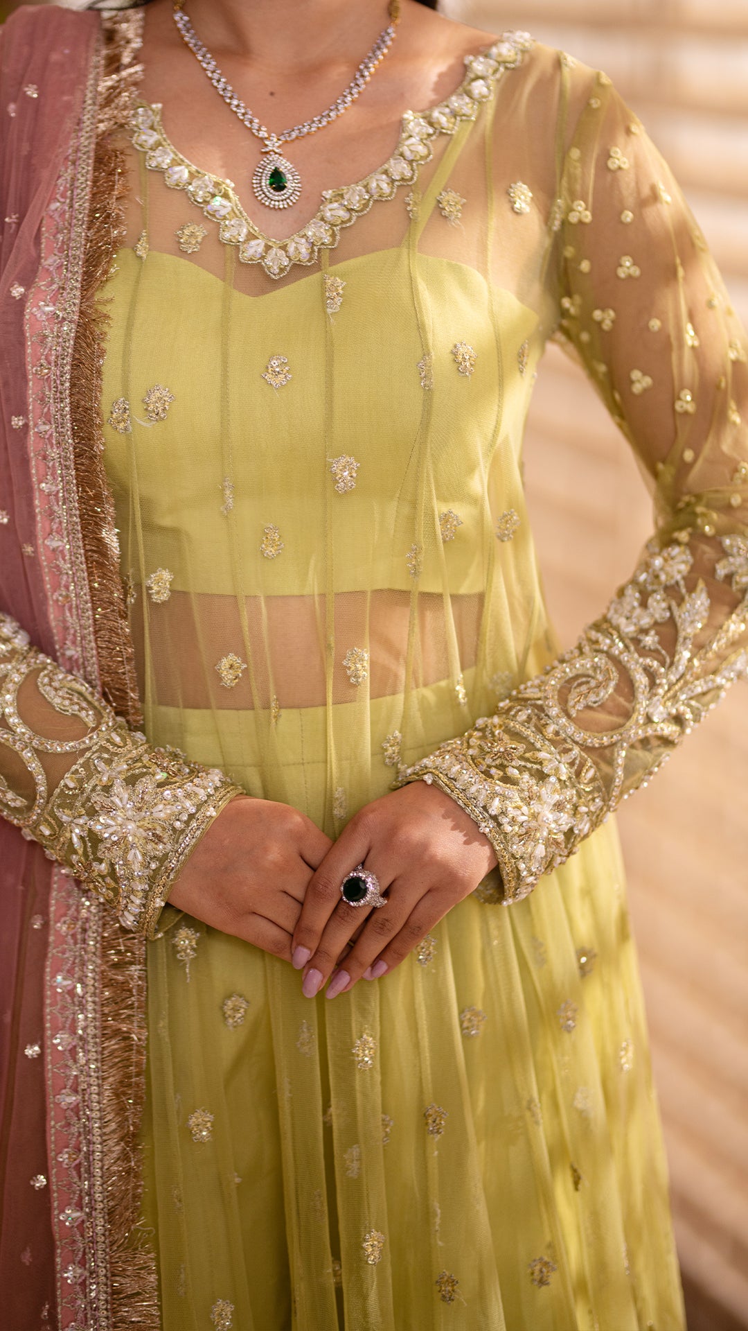 The vibrant lime green dress, crafted from lightweight net fabric, draws attention with its elegant silhouette. The intricate light gold embroidery adorns the surface, featuring delicate floral motifs and geometric patterns. The subtle shimmer of the gold thread adds luxury and sparkle. The contrasting dupatta complements the outfit with colour and texture, draped over the shoulders or elegantly around the neck.