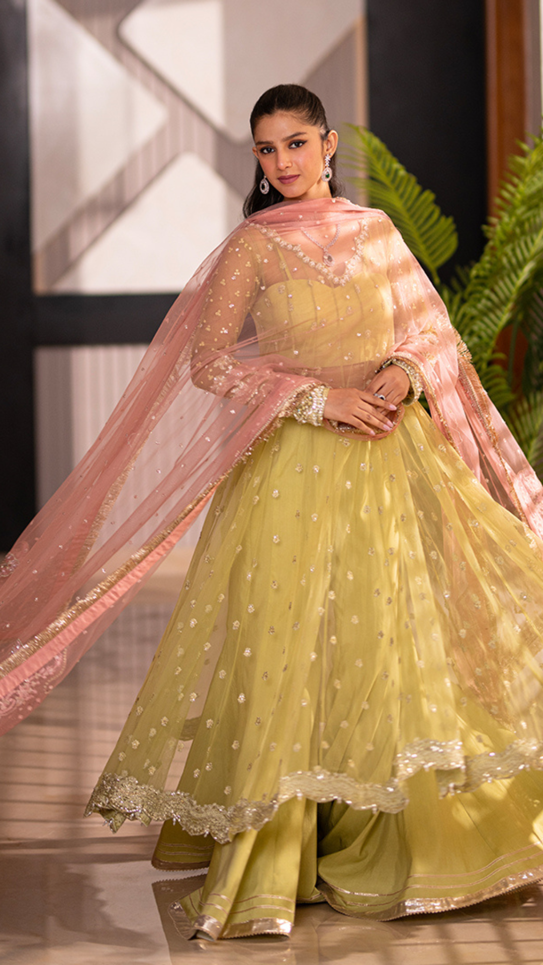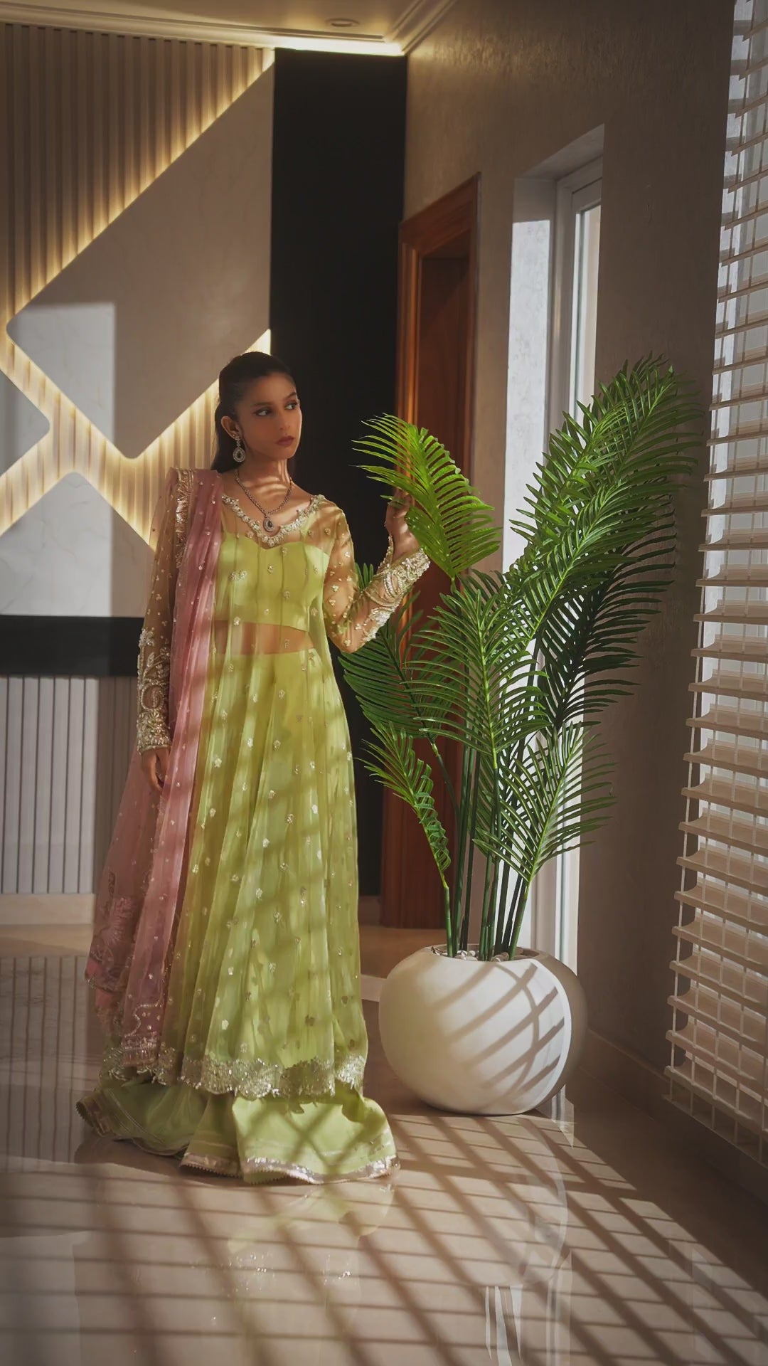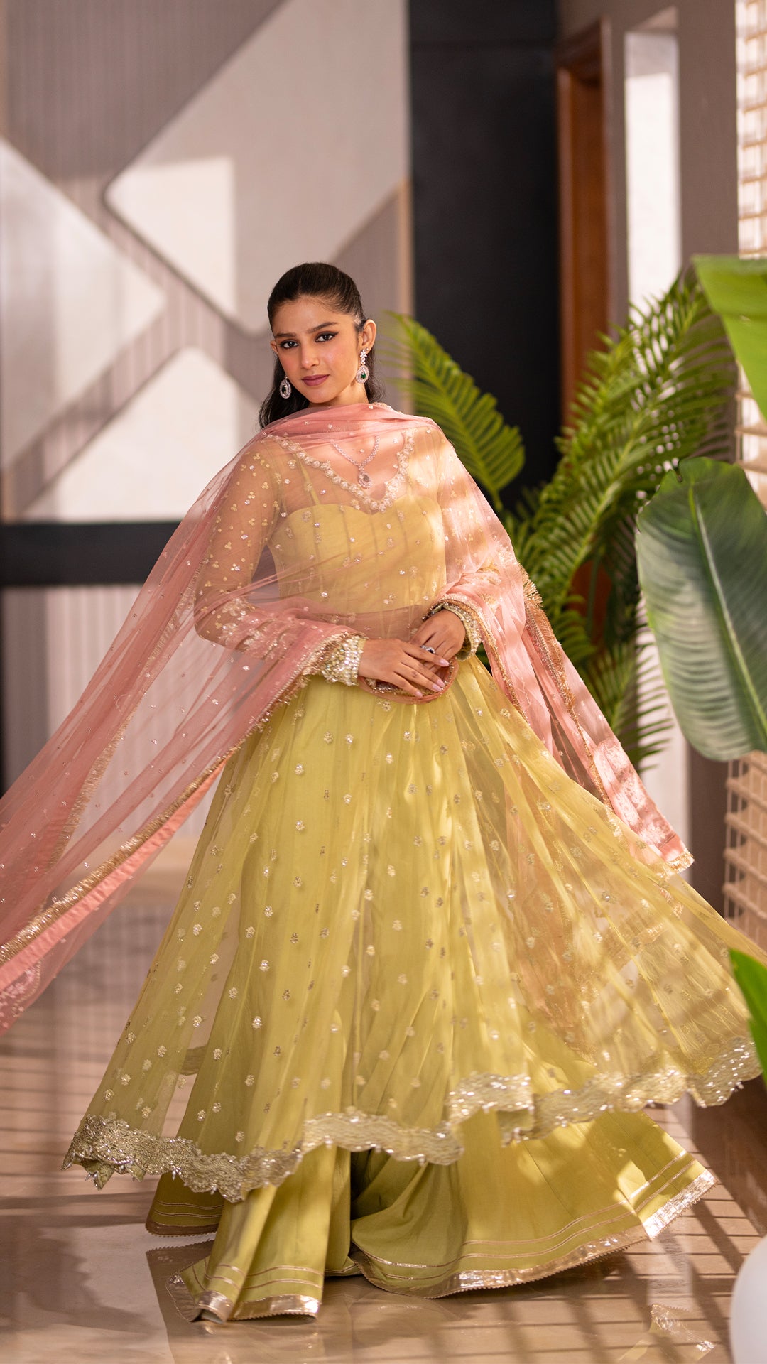 The vibrant lime green dress, crafted from lightweight net fabric, draws attention with its elegant silhouette. The intricate light gold embroidery adorns the surface, featuring delicate floral motifs and geometric patterns. The subtle shimmer of the gold thread adds luxury and sparkle. The contrasting dupatta complements the outfit with colour and texture, draped over the shoulders or elegantly around the neck.