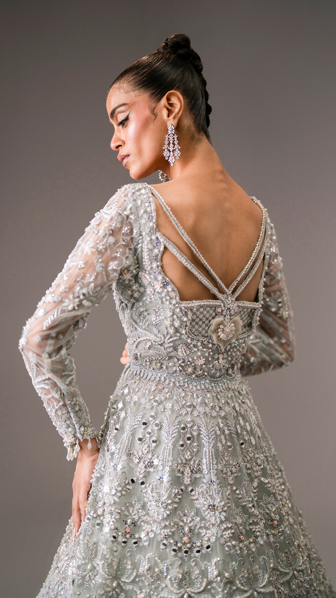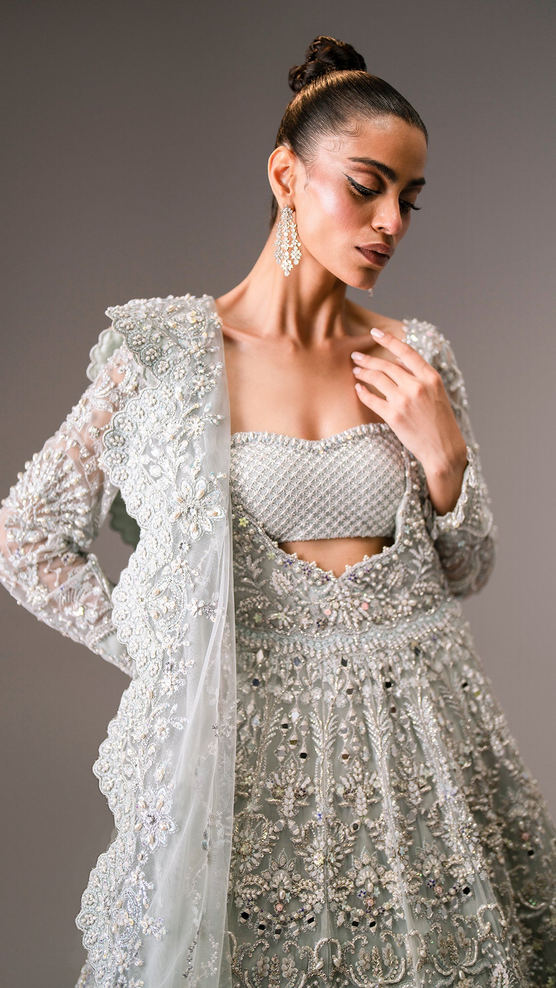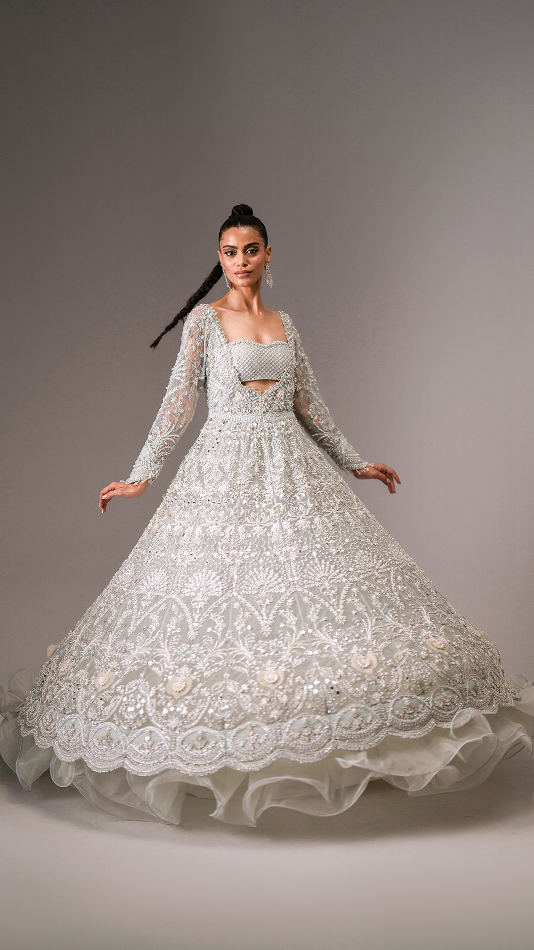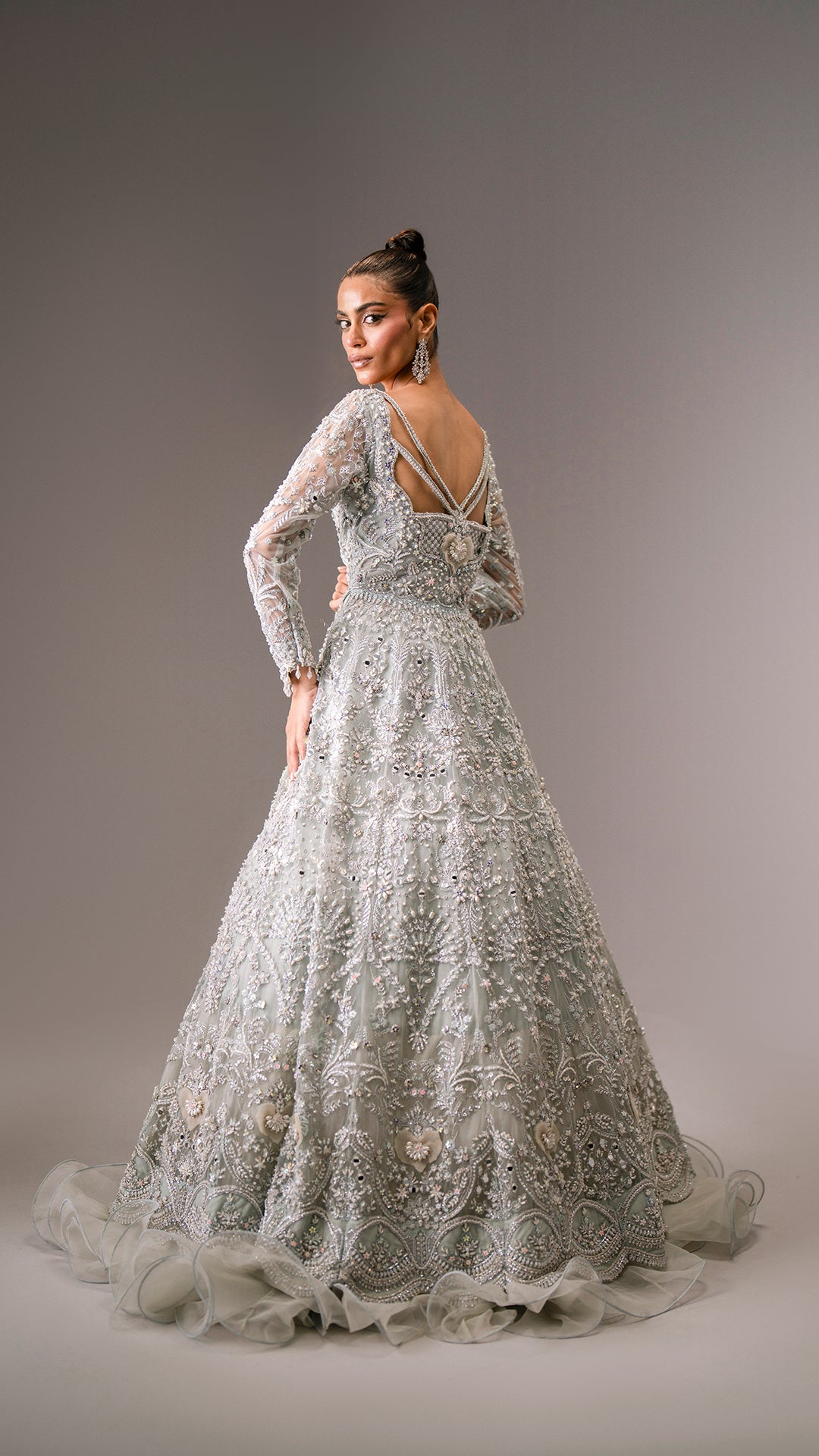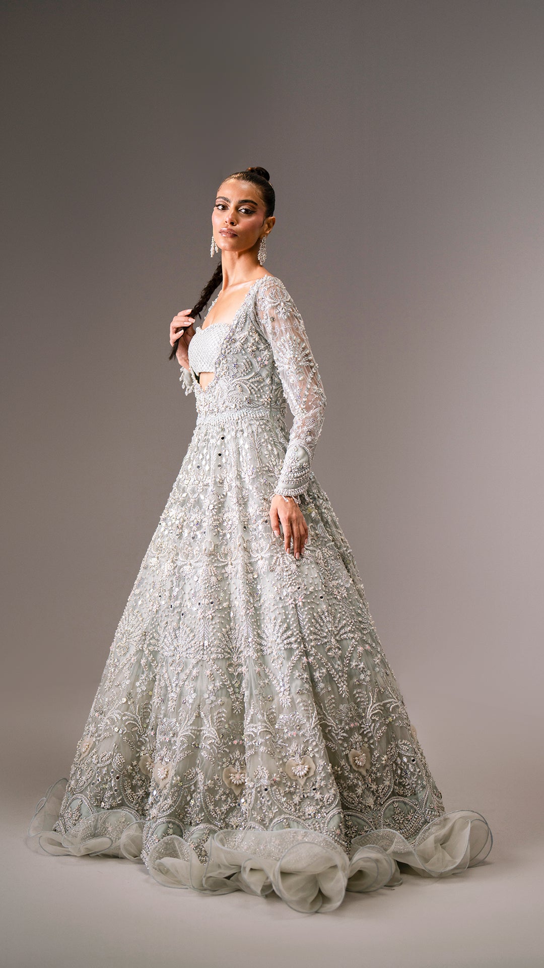 A mesmerizing powder blue organza creation named "Lydia" is adorned with intricate sheesha work and dabka, resulting in a timeless beauty. The incorporation of 3D floral motifs, along with a mix of crystals and pearls, gives this attire a majestic appearance. The ruffled organza lehnga gives this ensemble a modern touch. The scalloped design of the dupatta further accentuates the exceptional artistry showcased in this outfit,