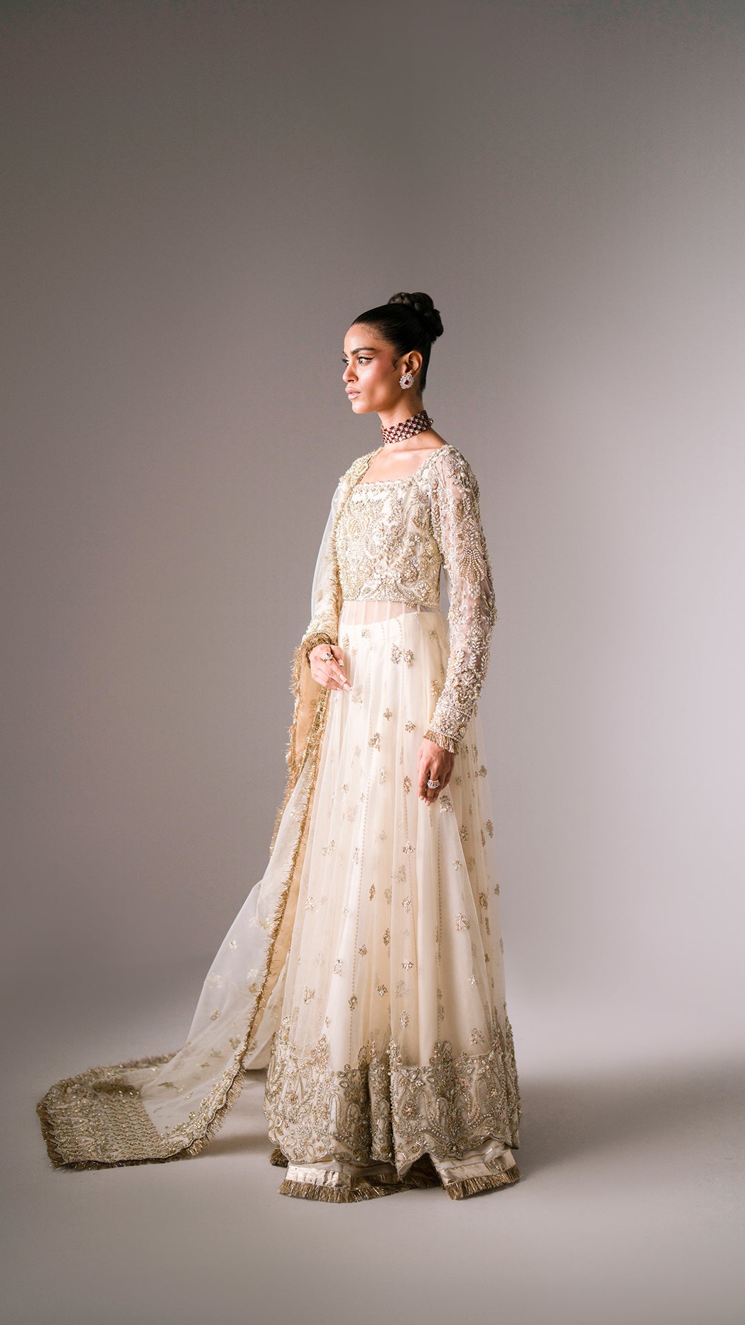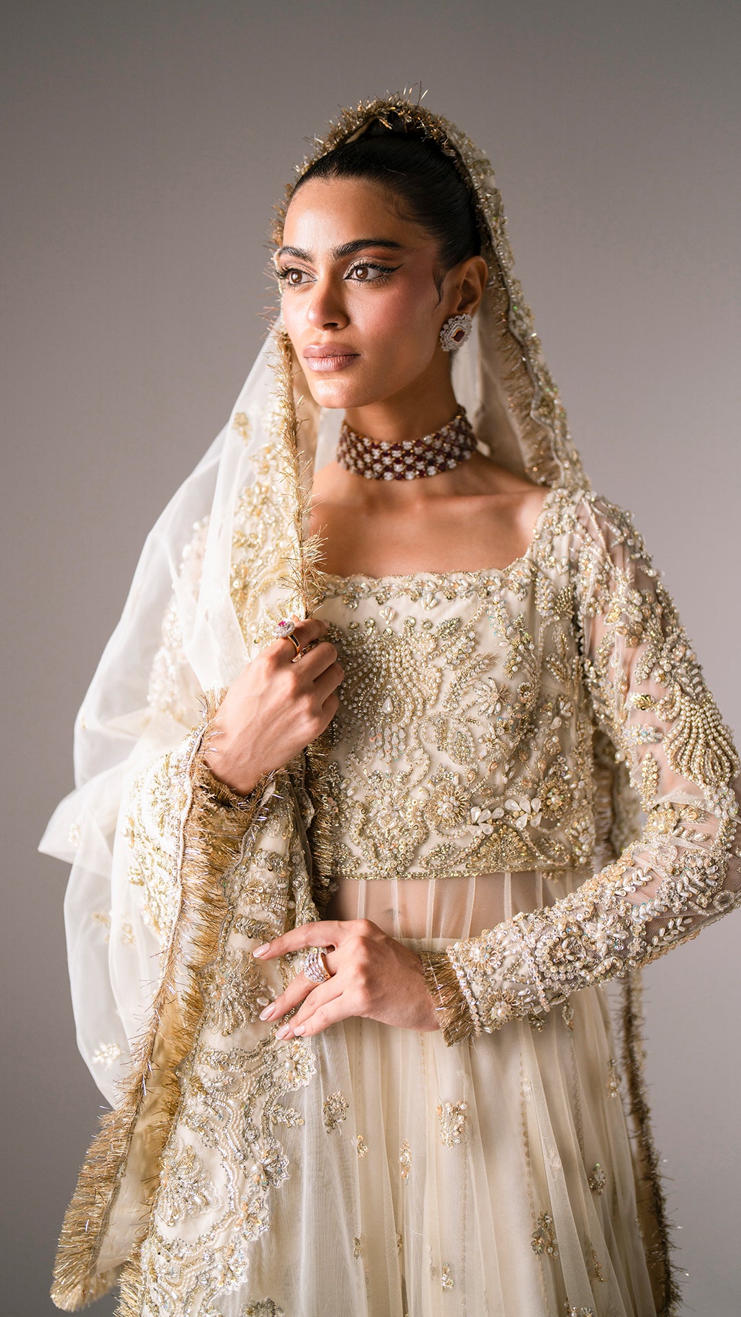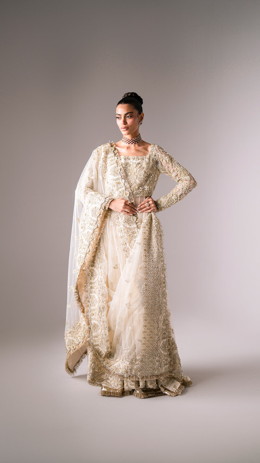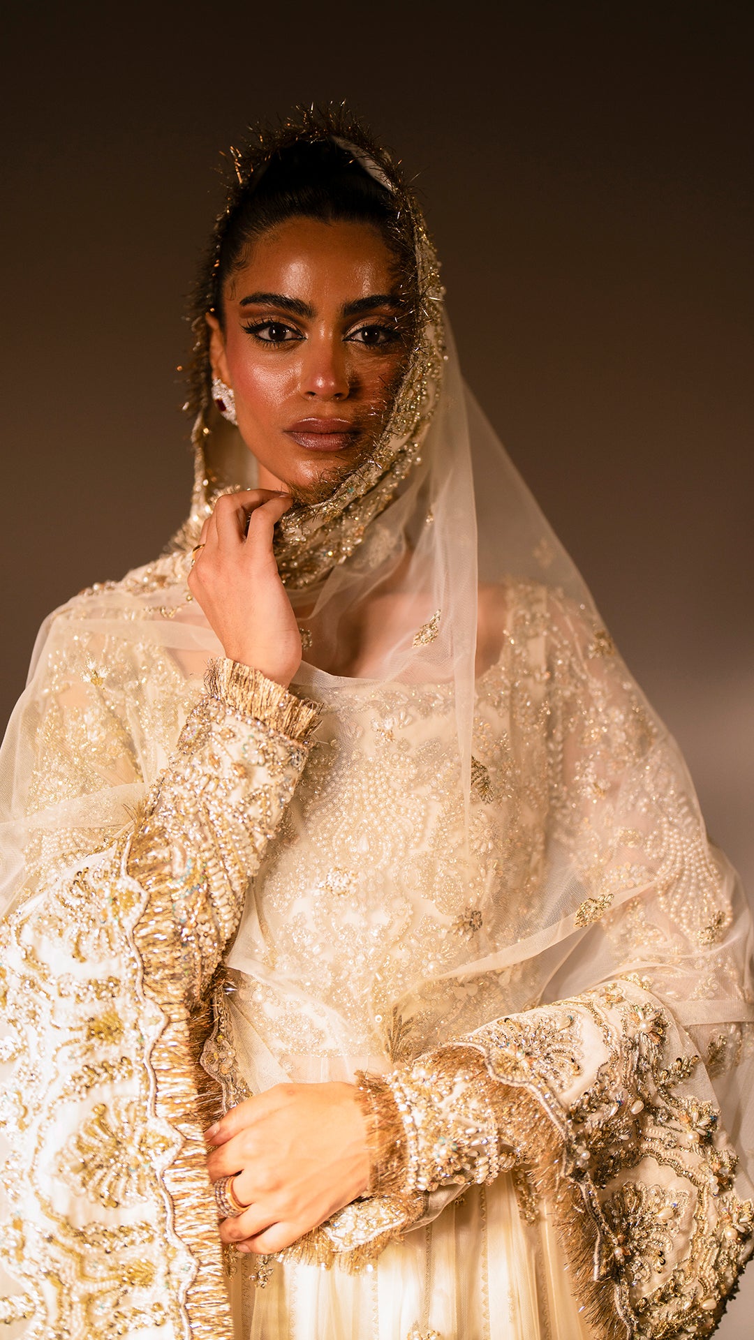 Imbued with a blend of heritage and precision, Mia stands out as a stunning ensemble in an ethereal off-white hue, weaving a captivating narrative of sophistication. This off-white Net pishwas and dupatta boasts intricate beadwork, a luxurious floral border on the ghera, and elaborate hand-embellished borders on the dupatta with lappa details on the sharara, embodying a true masterpiece of traditional craftsmanship. The elaborate hand-embellished detailing on the front body and sleeves showcases the artistry of gotta, pearls, and katdana.