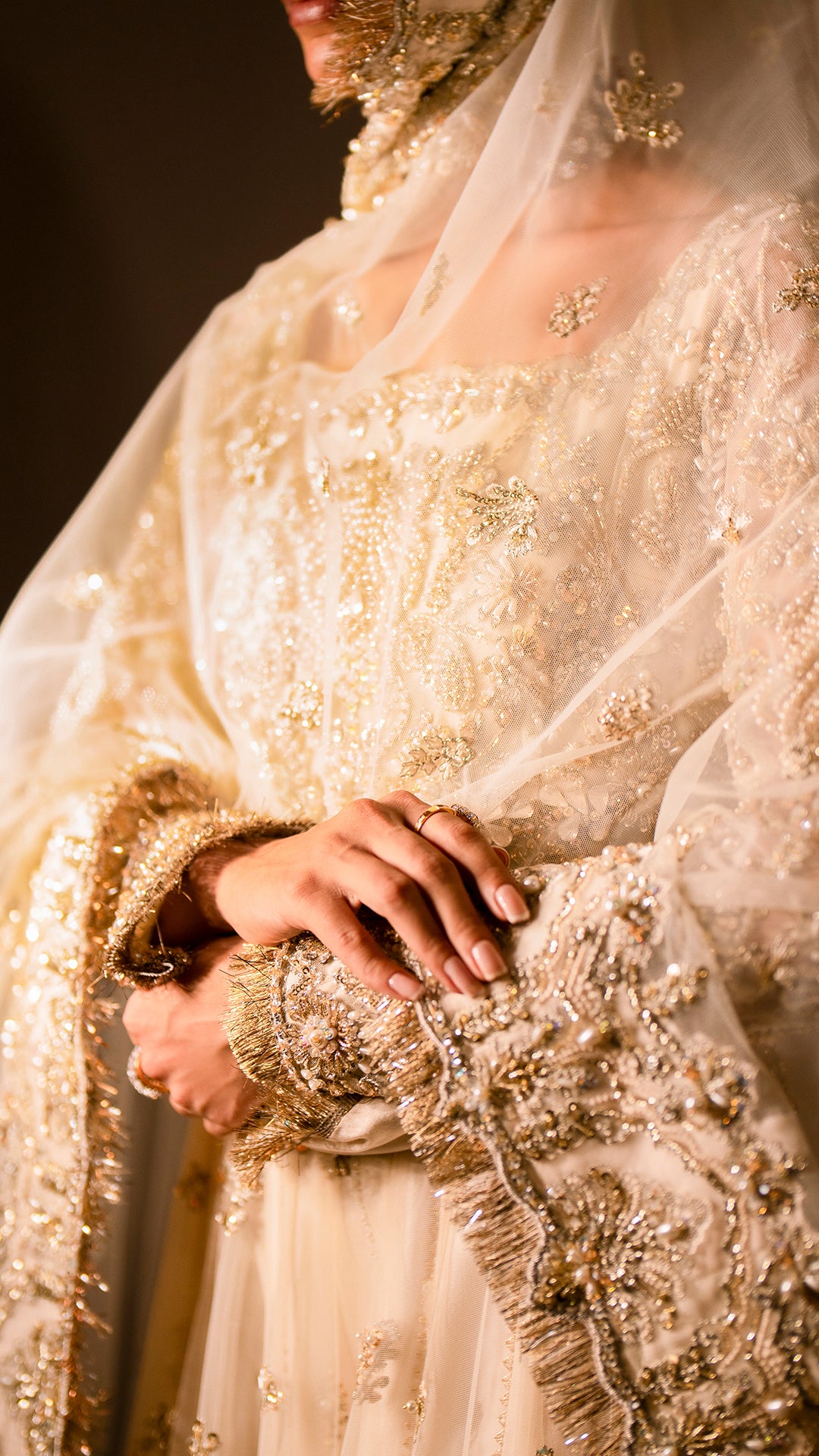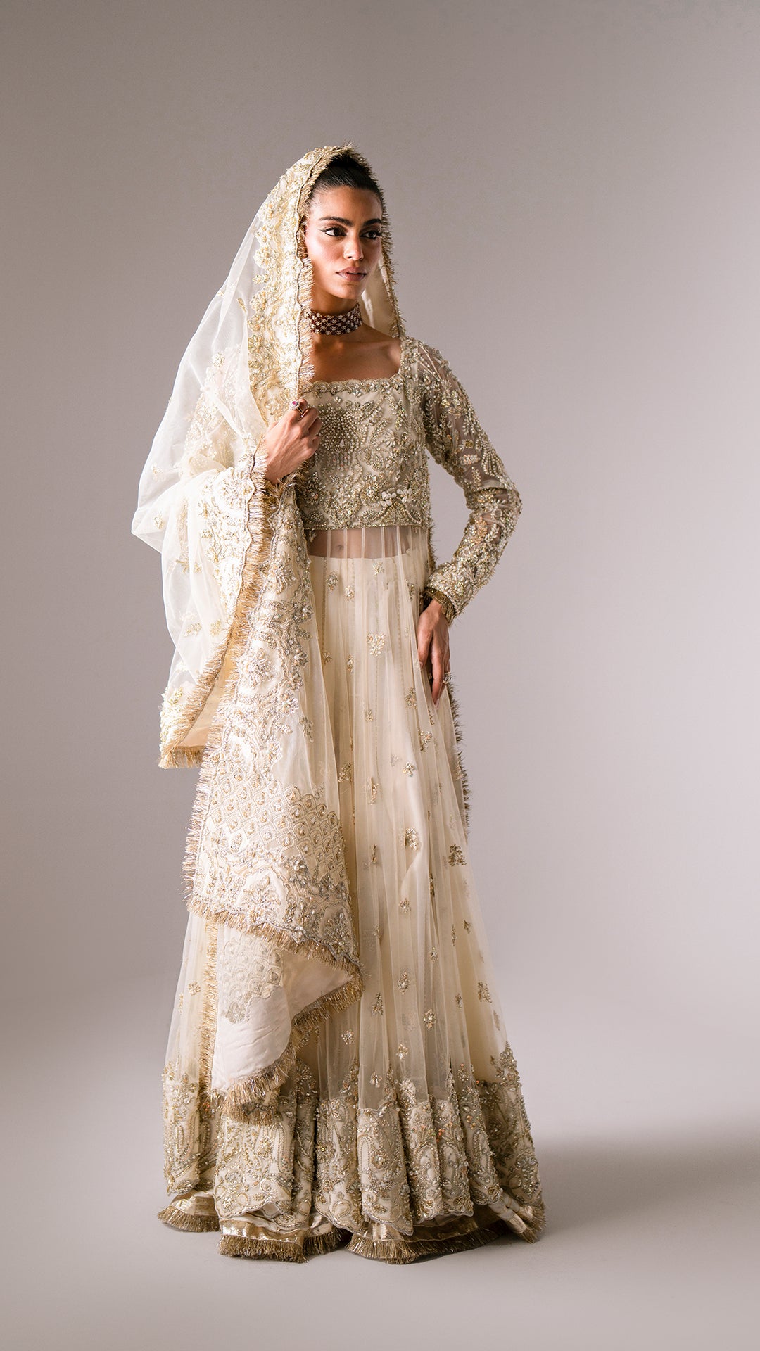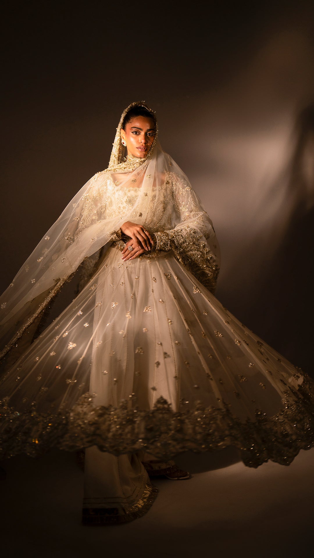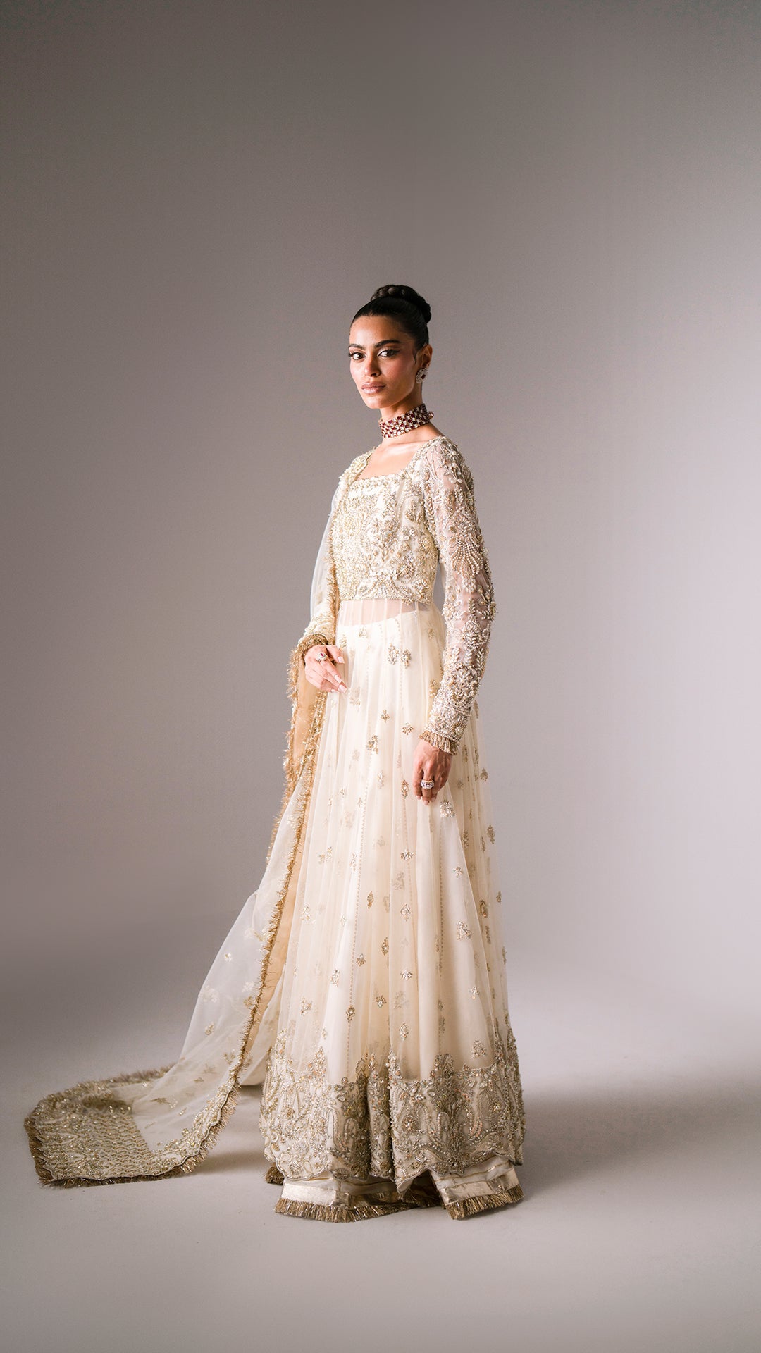 Imbued with a blend of heritage and precision, Mia stands out as a stunning ensemble in an ethereal off-white hue, weaving a captivating narrative of sophistication. This off-white Net pishwas and dupatta boasts intricate beadwork, a luxurious floral border on the ghera, and elaborate hand-embellished borders on the dupatta with lappa details on the sharara, embodying a true masterpiece of traditional craftsmanship. The elaborate hand-embellished detailing on the front body and sleeves showcases the artistry of gotta, pearls, and katdana.