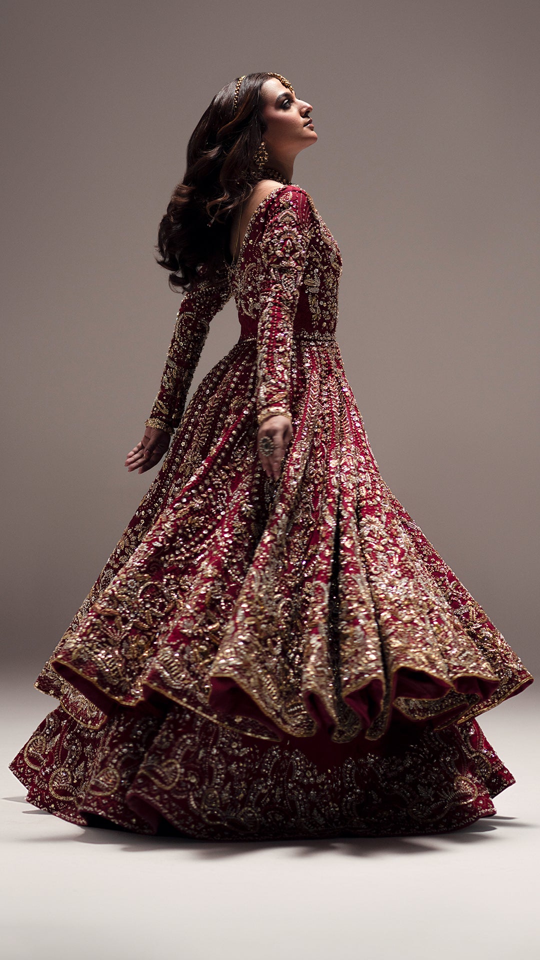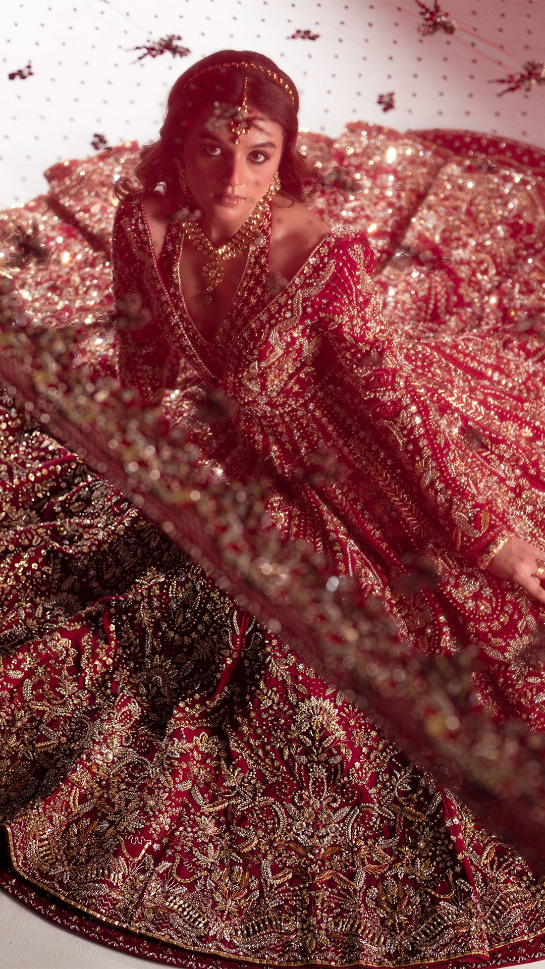 A sumptuous crimson red lehenga featuring rich antique-gold detailing and regal design elements. Expertly constructed, it offers a perfect harmony of traditional craftsmanship and contemporary bridal sophistication.