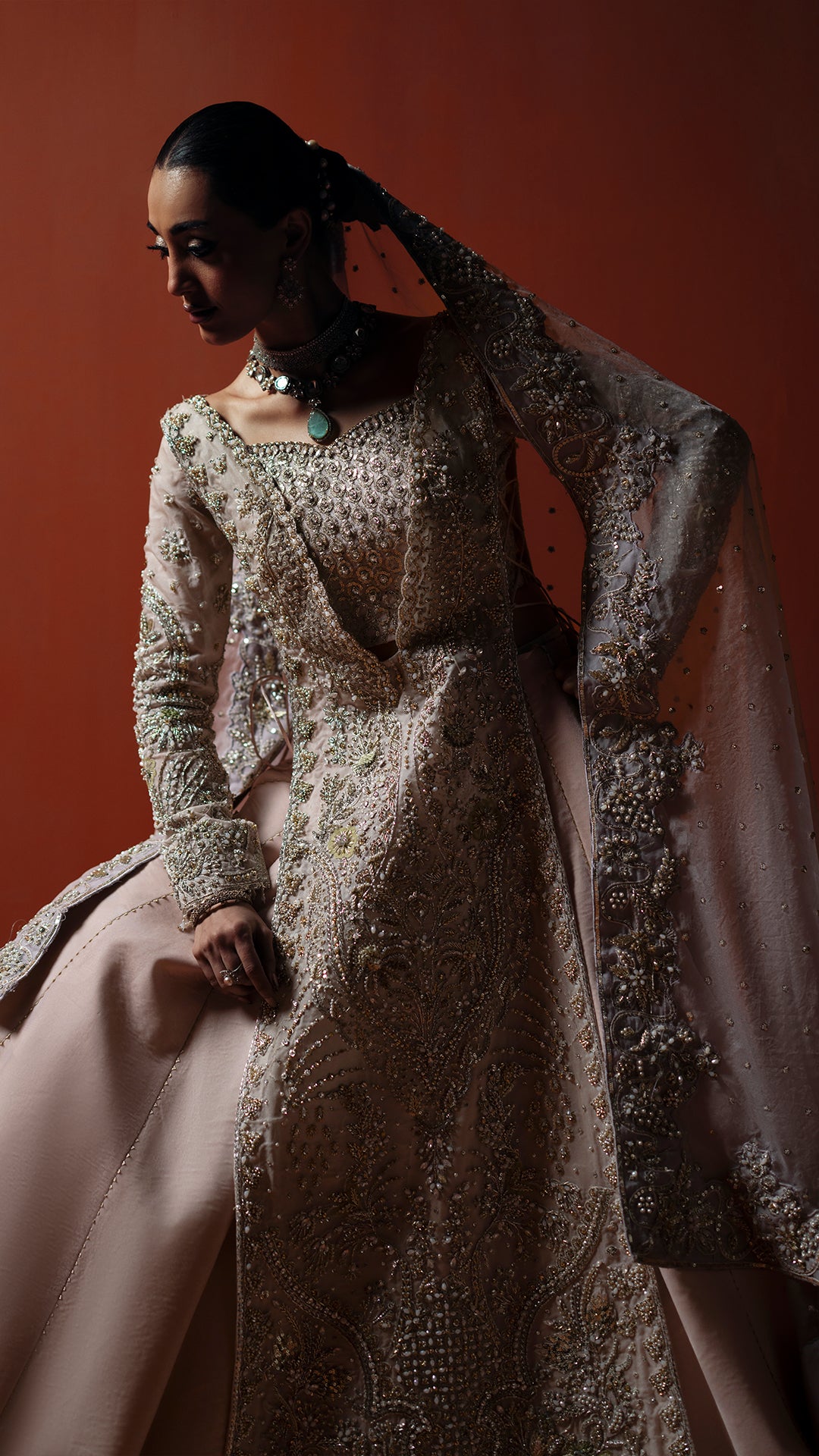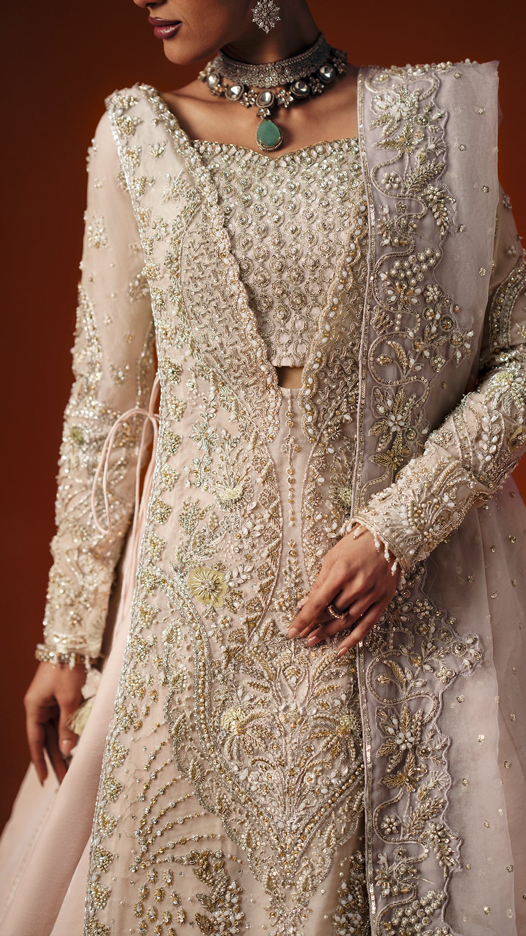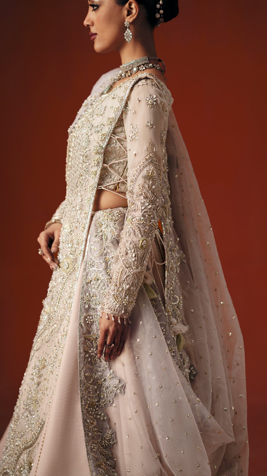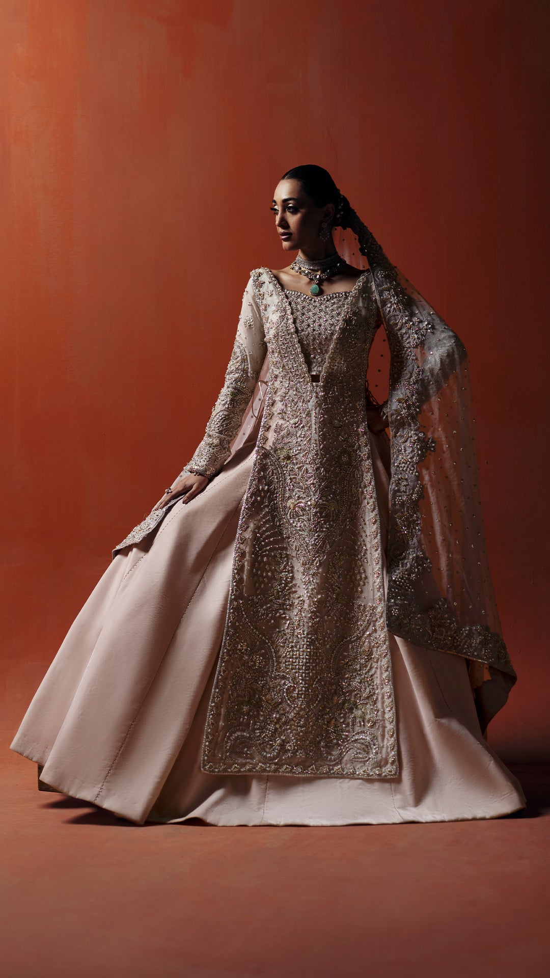A powder pink modern silhouette, strategically embellished with a high impact mosaic of sequins, katdaana, baithki, naqsi, and dabka to deliver controlled shimmer in motion. Finished with an organza dupatta and velvet lehnga, the look is purpose built for refined, intimate settings.