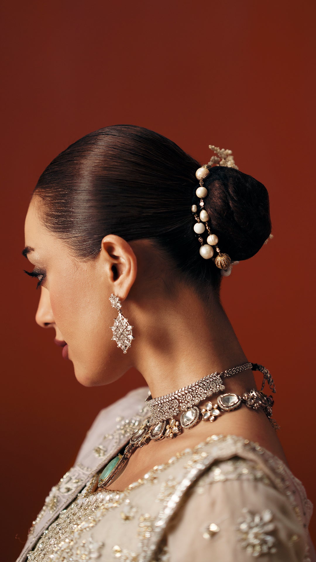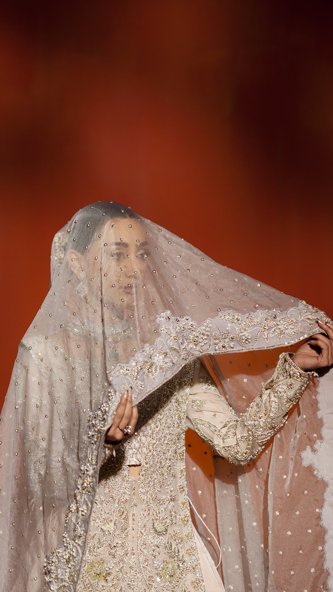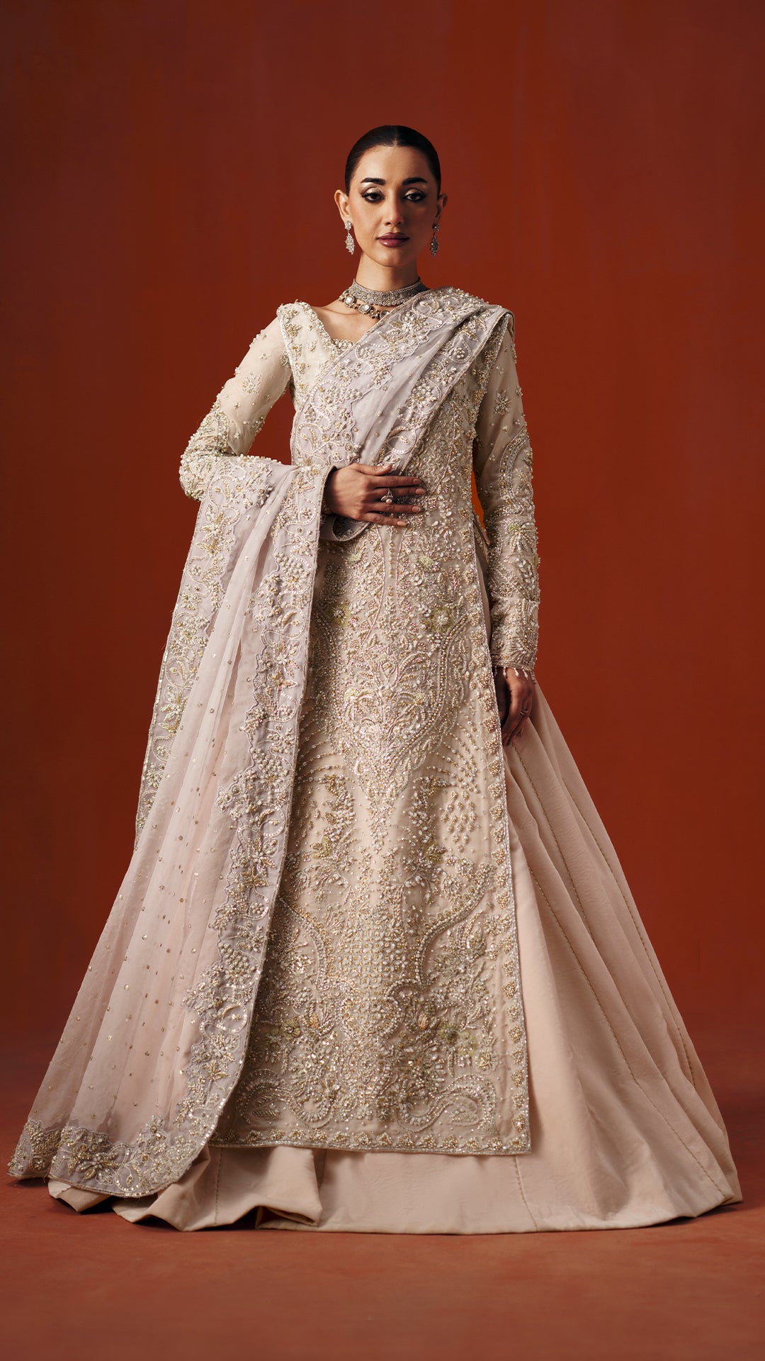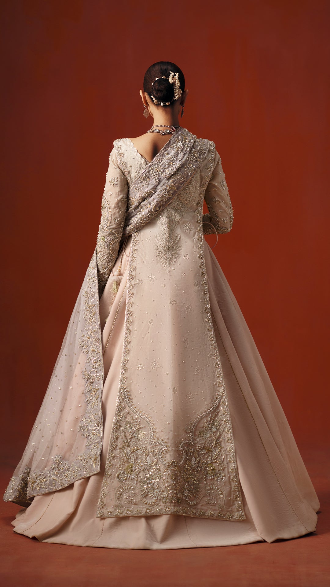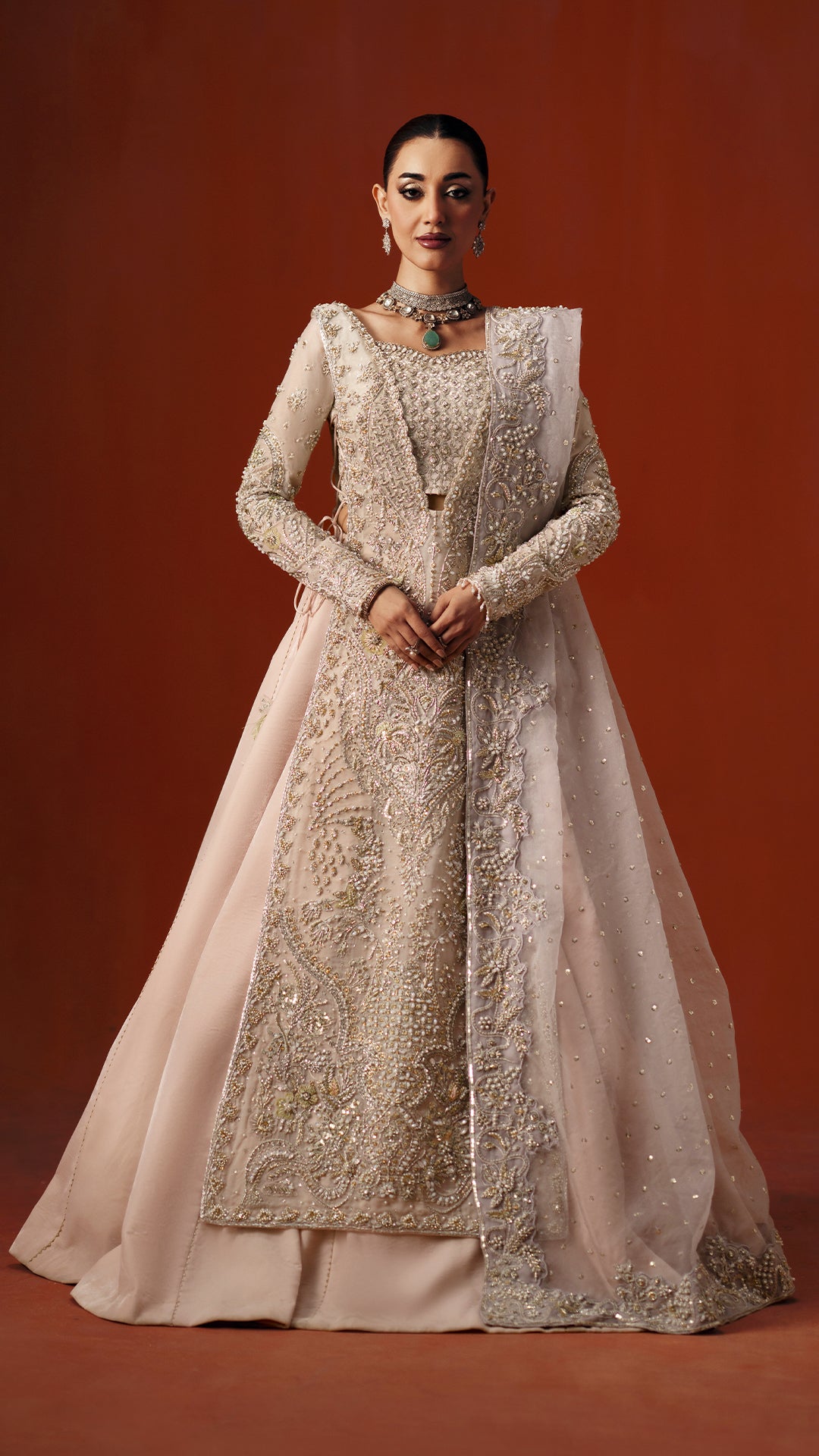 A powder pink modern silhouette, strategically embellished with a high impact mosaic of sequins, katdaana, baithki, naqsi, and dabka to deliver controlled shimmer in motion. Finished with an organza dupatta and velvet lehnga, the look is purpose built for refined, intimate settings.